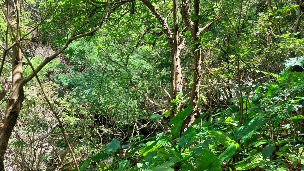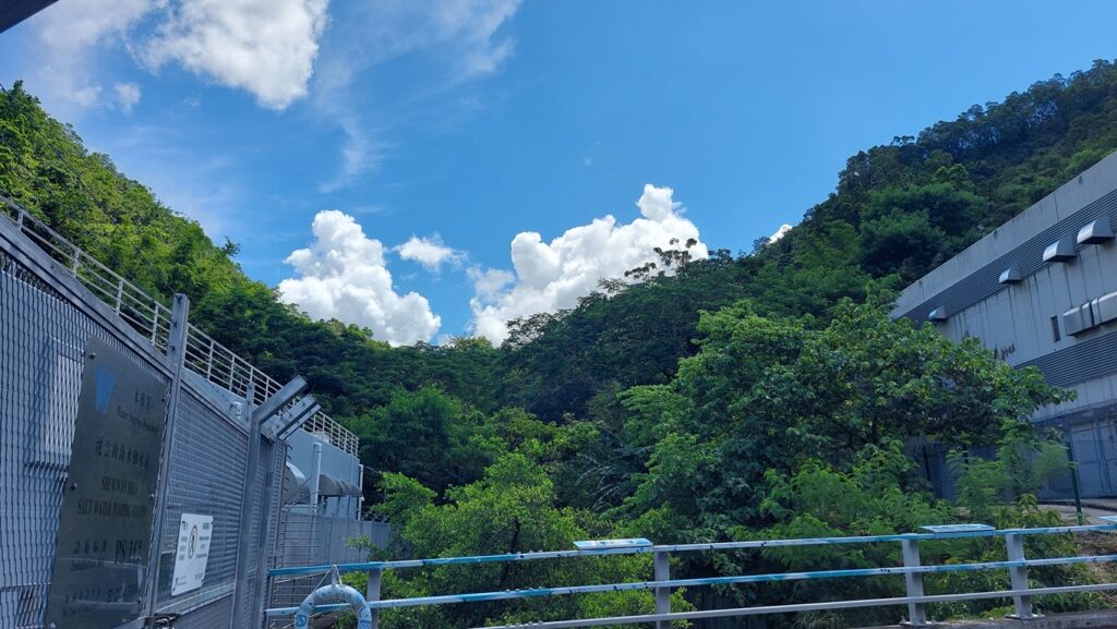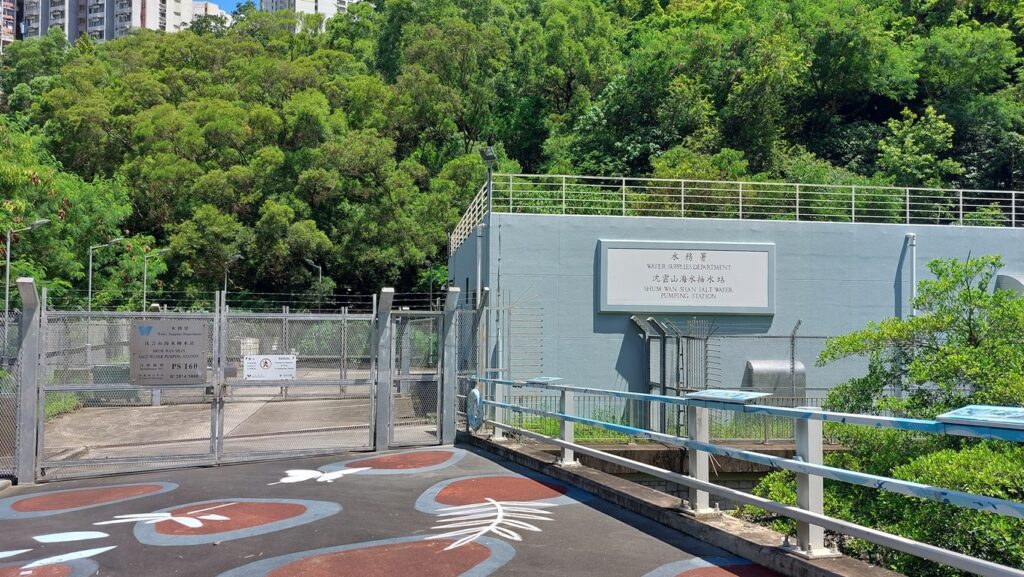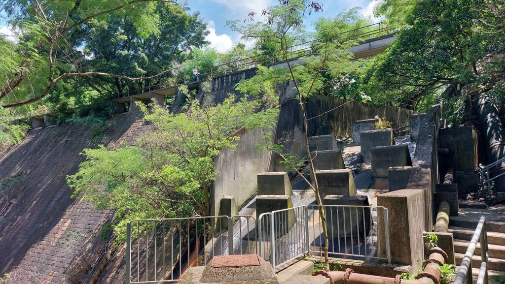 左邊及右邊為抽水站。佐敦谷和大壩掩沒入樹叢中……