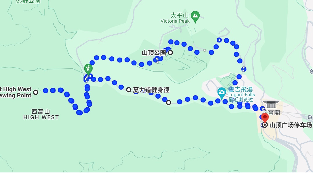 - 線路:山頂廣場➡凌霄閣➡柯士甸山遊樂場➡山頂花園➡夏力道健身徑➡夏力道環迴休憩處➡西高山頂➡夏力道➡山頂廣場