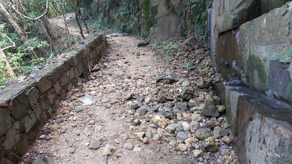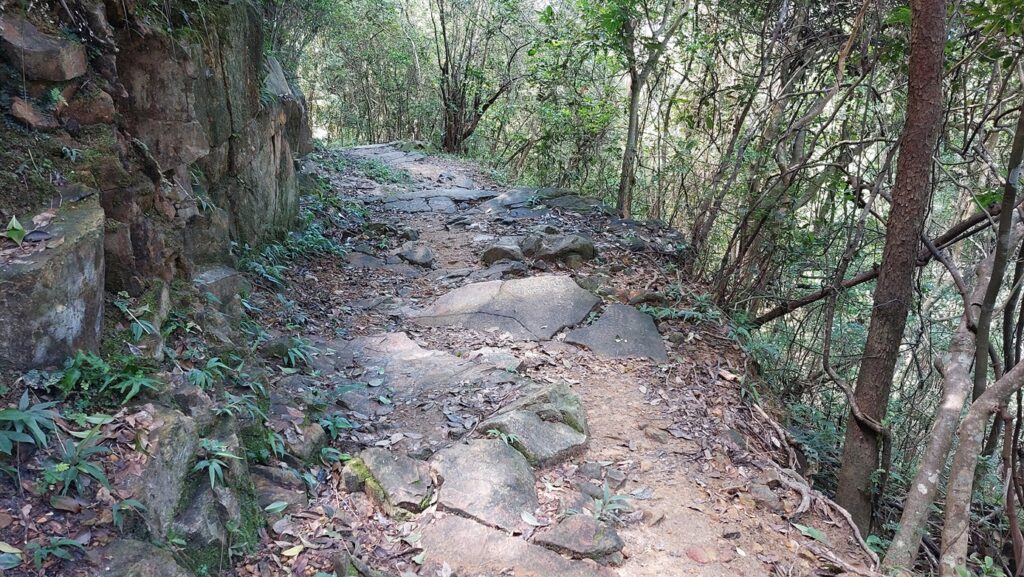 泥巴,石塊,碎石,藤蔓,枯枝,落葉,積水,路面坑洼,山徑的特點。港島徑三、四段是初入門行山者練習行山徑的好地方。