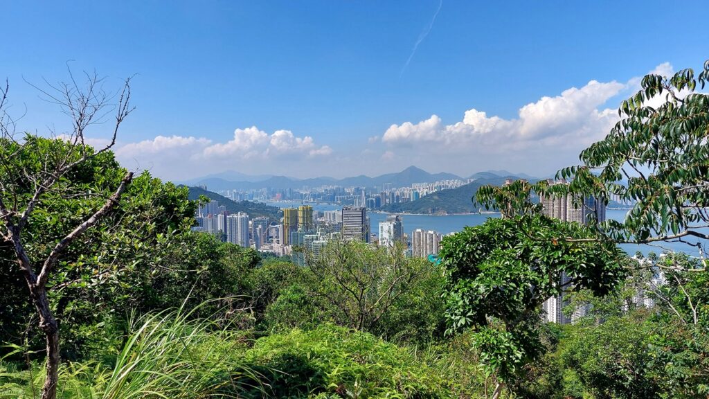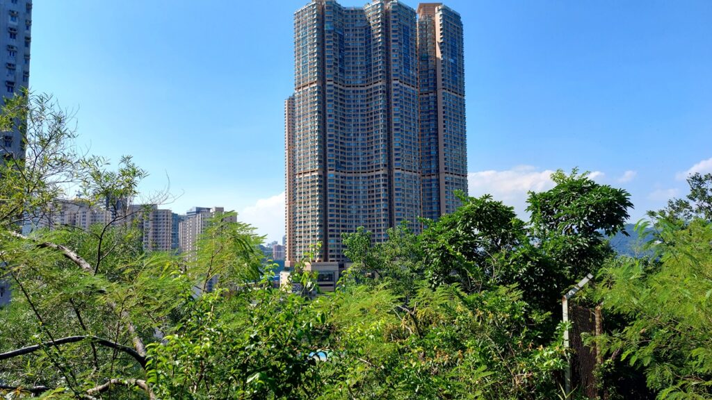 從最高處,沿砵甸乍山郊遊徑下坡落山,不少梯級,這時可看到九龍市區了。直至哥連臣道花園。