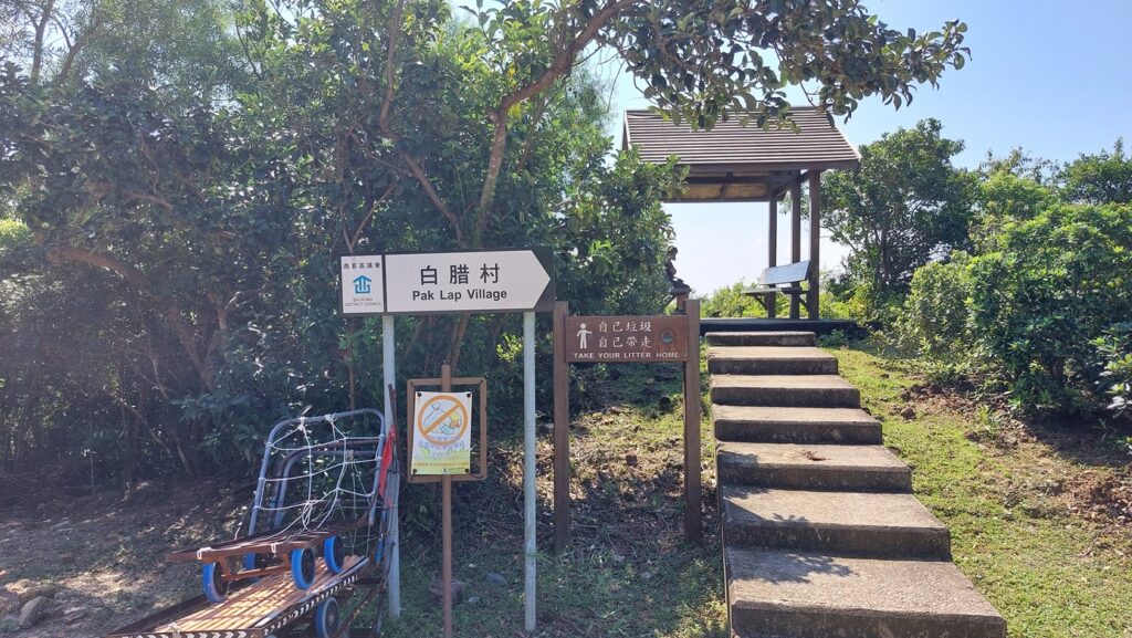 在東壩盡處的涼亭轉接水泥山徑,經過山坳後,浪茄灣乍現眼前,灣旁的長臂則是岬角罾棚角咀。沿山徑上至標尖角,觀景後返東壩。可乘車離去或續走麥理浩徑第二段。