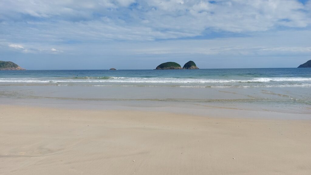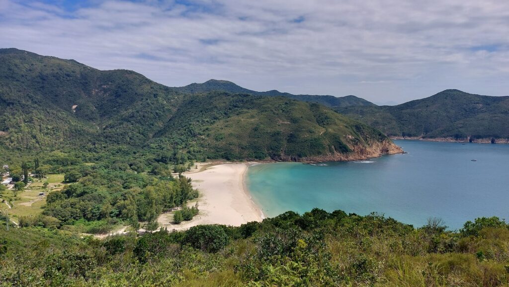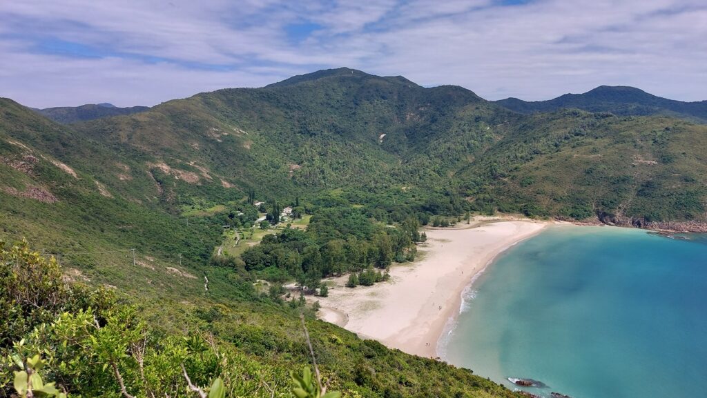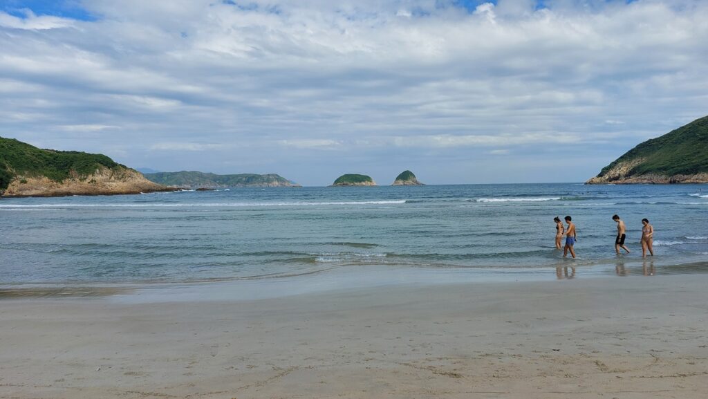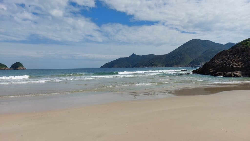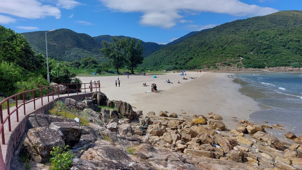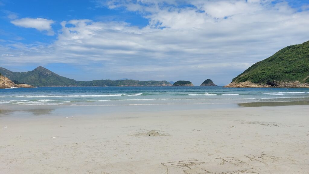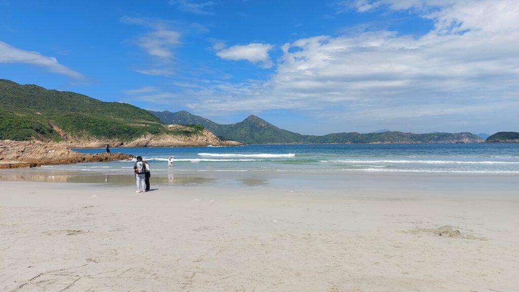 海灘,一個接一個,一個比一個靚,特別是咸田灣,更甚一籌。遠離市區,游泳人不多,環境保護得很好,接近自然狀態。沙灘上潔白的細幼沙粒,海水清澈,不斷涌來的海浪,卷起白色浪花,伴隨著悅耳的海浪聲。海灘四周綠樹成蔭,遠處的蚺蛇尖,海灣入口的小島,把海灘襯托得更加美麗。身處其中,真是享受,不愧被稱為香港最美海灣。