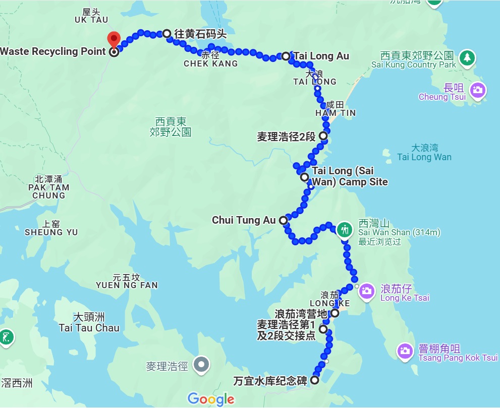 因小巴在萬宜水庫東壩落車,要行一公里多才到M徑第二段的起點。因此,本段實際路程超16公里。