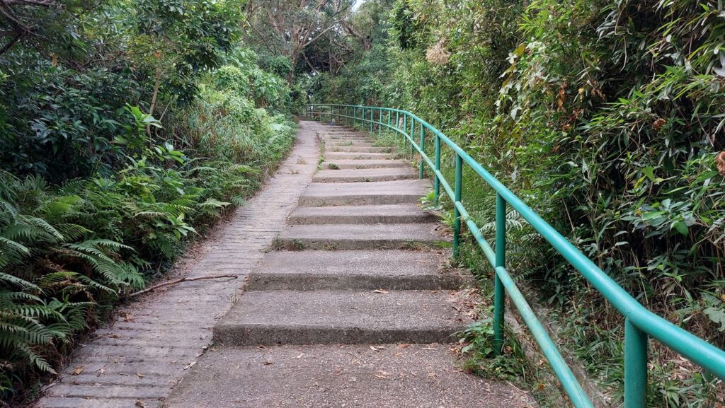 前往釣魚翁山頂。先是從廟仔墩山頂,沿陡峭的石梯下到山坳。然後,上攀登釣魚翁頂峰,攀登高度約90米。先是一段陡峭的梯級,路很狹窄,途中有一稍闊位可影下相。再沿更陡斜的梯級上攀,很快就到山頂了。