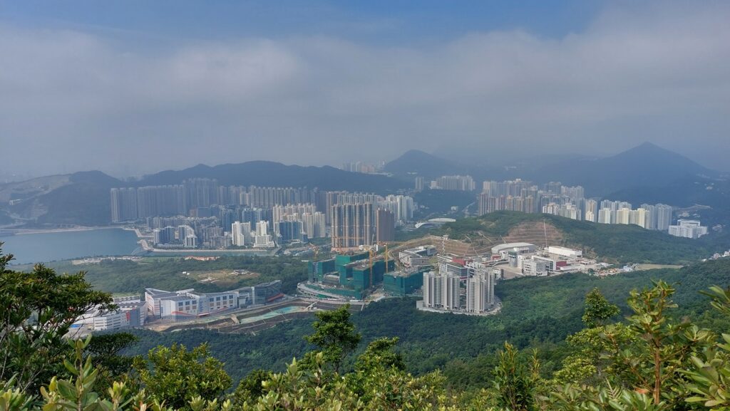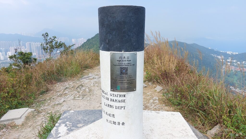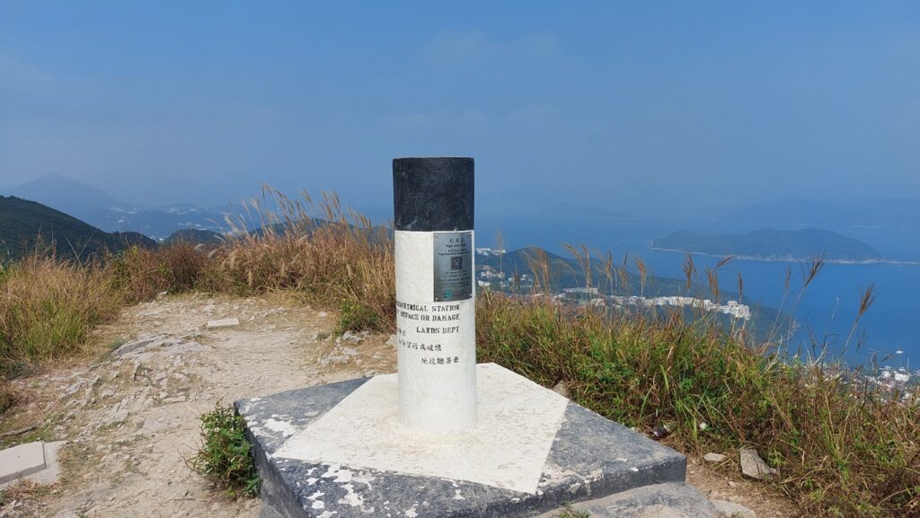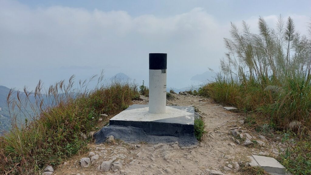 通常,香港不少山頂上建有三角綱測量站。是香港地政總署測繪處設置,用於測量位置,如高度、坐標等。三角測量站底座為黑色水泥方塊,塊上的白色箭頭指向N即北。底座上有一圓柱形柱,俗稱標高柱,高約1m。標高柱上寫有一些標誌性文字,有些還有一銘牌,銘牌有測量站的基本信息。其中,標高高度是指柱頂小三角形位的高度,因此,實際山頂高度是標高減去1m。例如,此山頂三角綱測量柱標高是345m,山頂實際高度是344m。