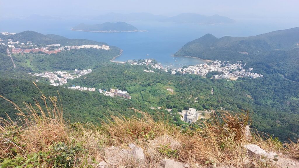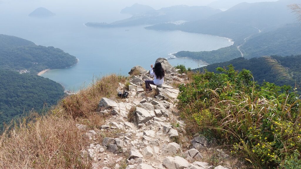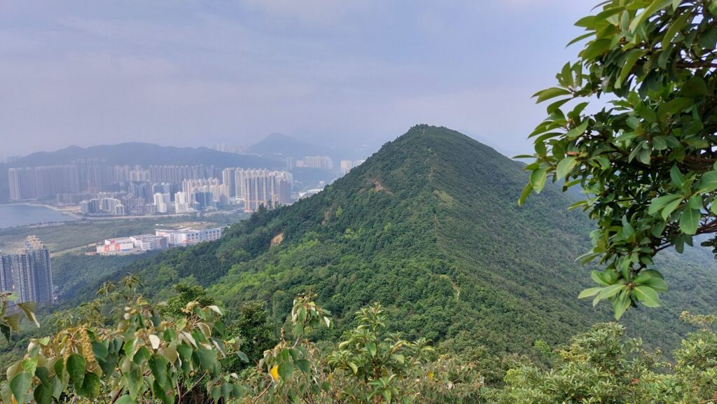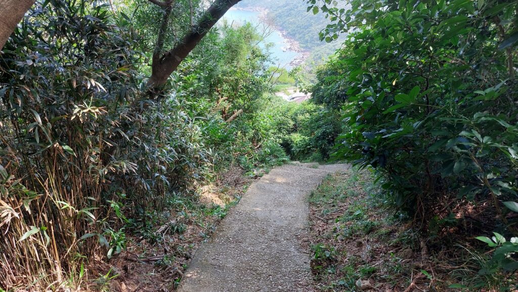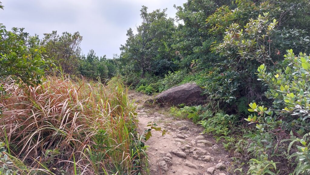 廟仔墩另一邊下坡,石塊路較陡峭,下降至小谷,再上攀至釣魚翁山頂。上攀釣魚翁路徑非常陡峭,但石塊梯級不算難行,且從小谷攀升不過百米,很快就到山頂了。觀景打卡後,從另一邊坡下走,下坡路與上山路相差不大,很快便可接回郊遊徑。