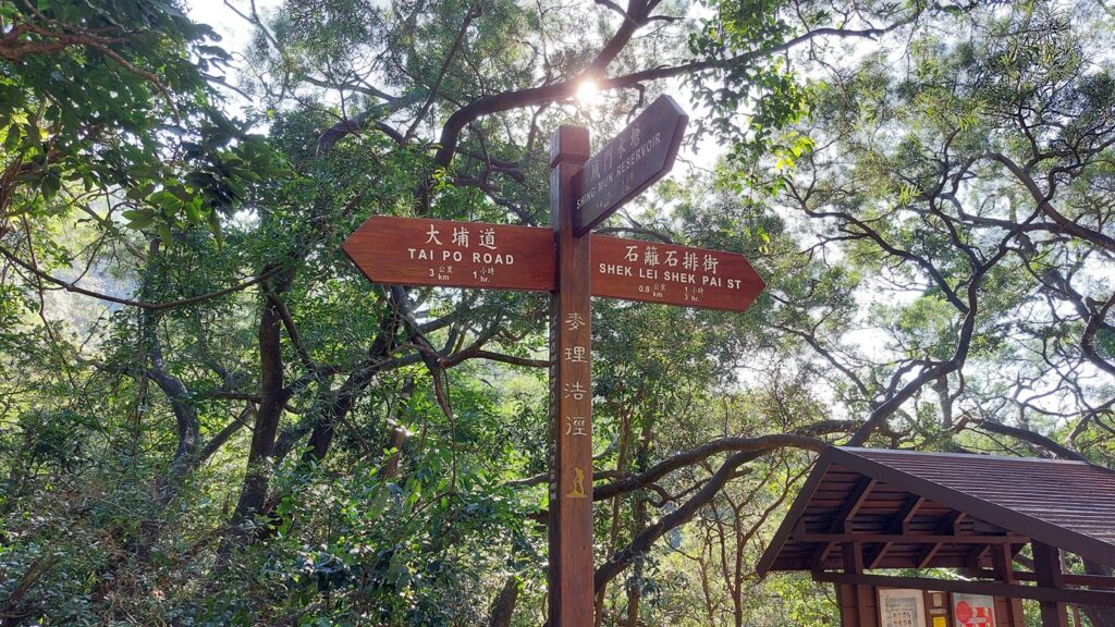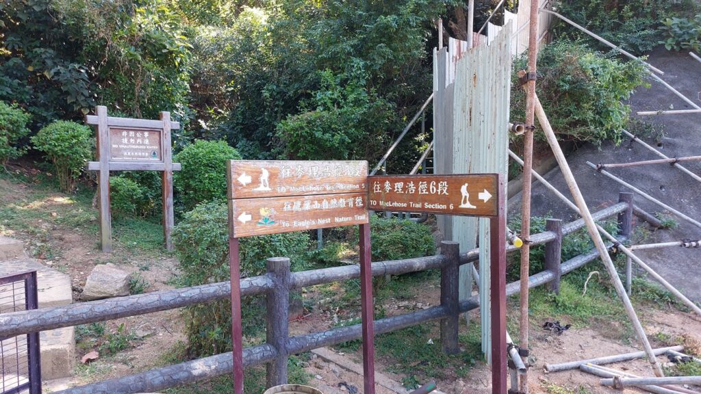 在此右轉隨山徑下降,途中兩度橫跨馬路。及後在涼亭右走,經鷹巢山自然教育徑至大埔公路,完成麥理浩徑第五段。
