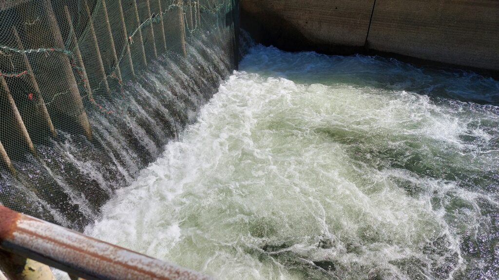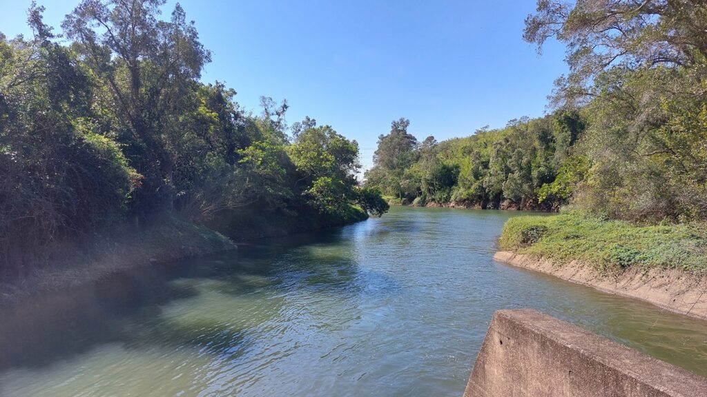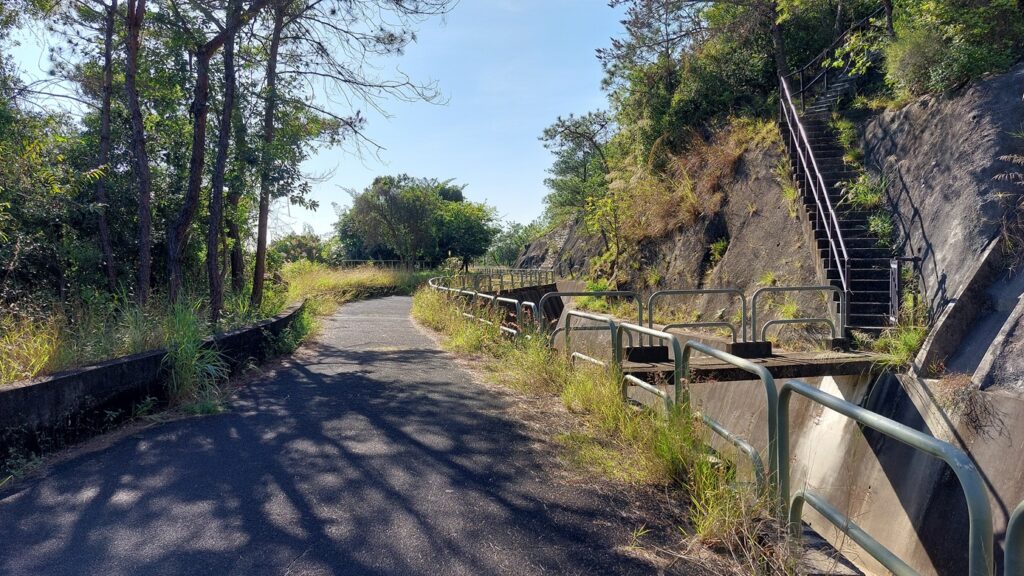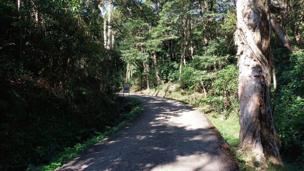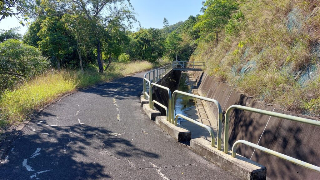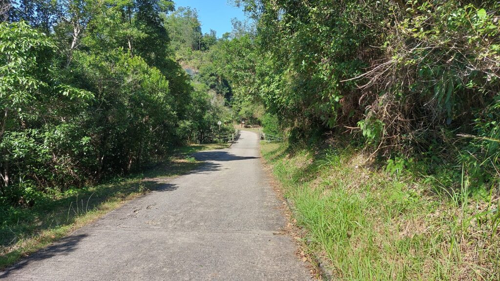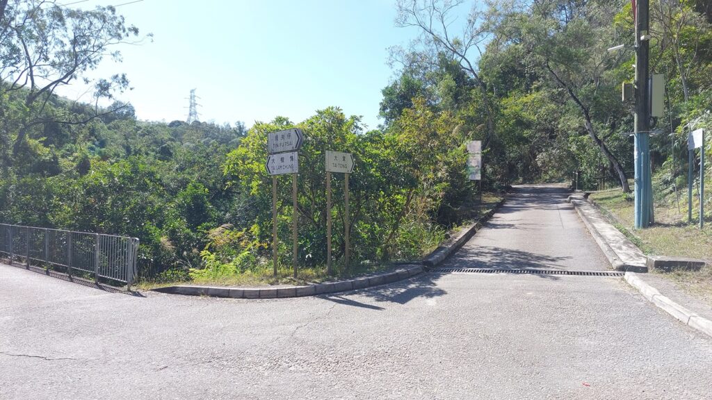 沿徑一直行走,很快便可接至林道,往下就是漫長的水泥路。沿林道下行,可下瞰大欖涌水塘的塘中小島。下降至小壩後,再走一段,便見右方的郊遊地圖牌。由此右轉,轉走引水道。