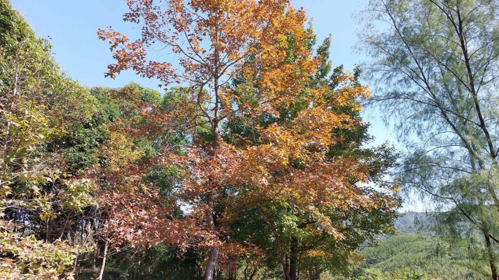 沿麥理浩徑的指示牌行走,會遇上多條支線,可分別通往白石橋、蓮花山、柴灣角、河背及青龍頭等地。路旁主要為相思樹,次之為潤楠屬的樹木。潤楠的果梗鮮紅,醬果紫黑,在這較單調的路段上甚是搶眼。當中也有數棵佇立路中的高大楓香樹。其後也多見白揪、山棯、地稔及毛稔等郊野常見植物。