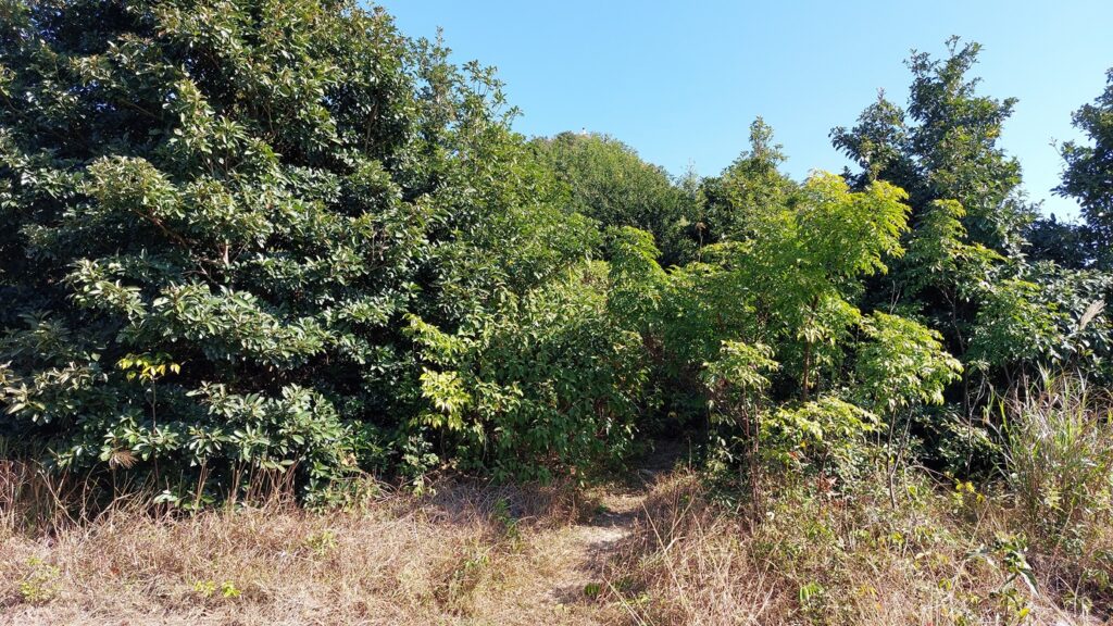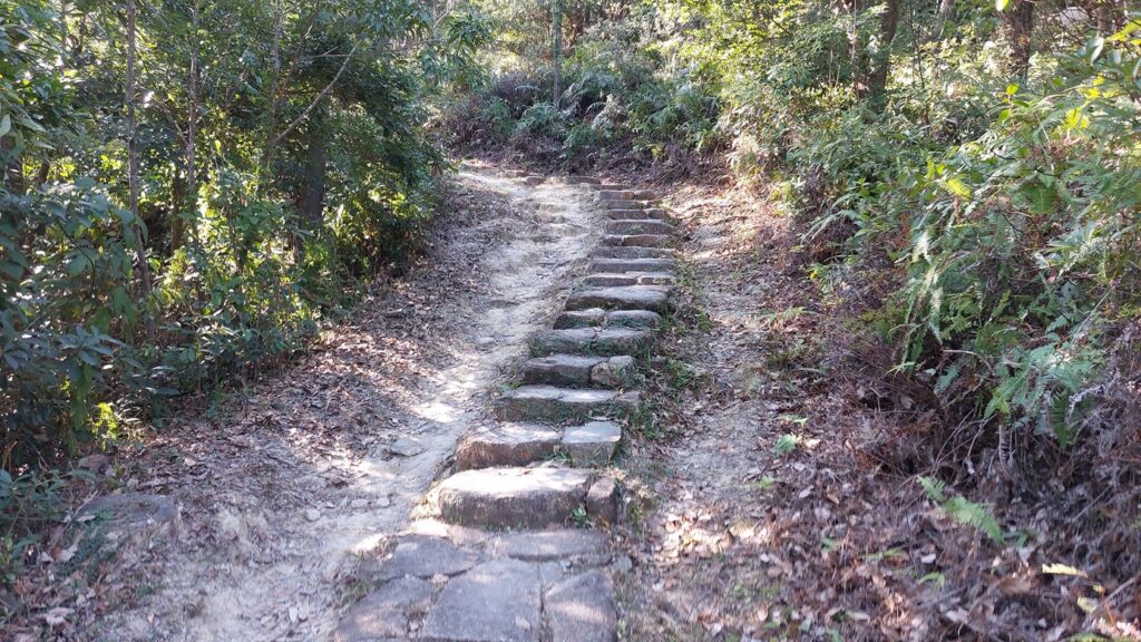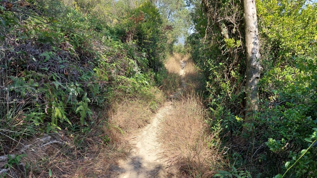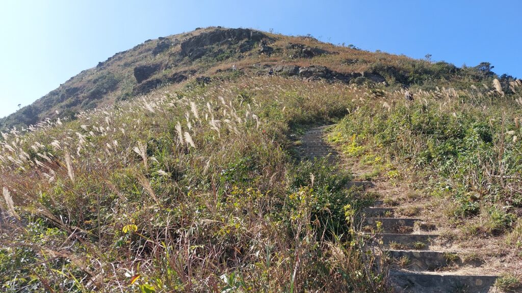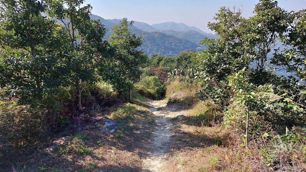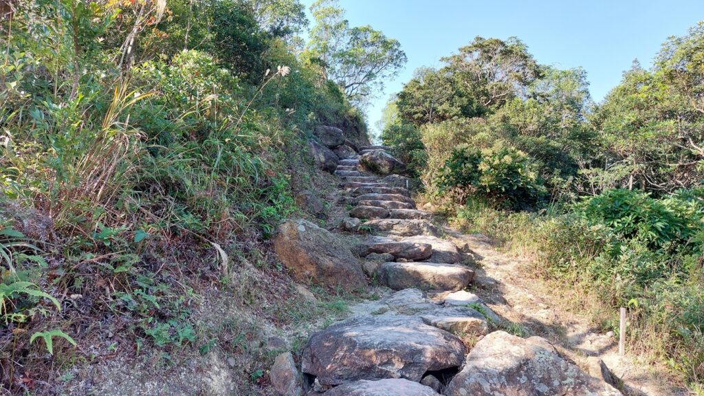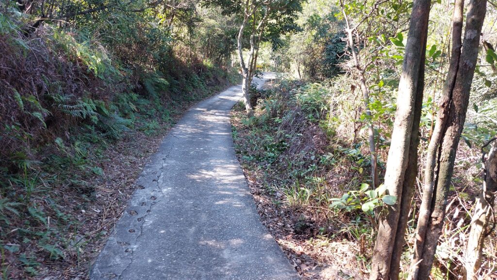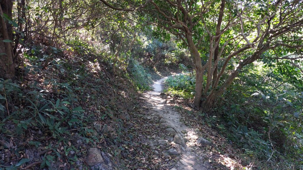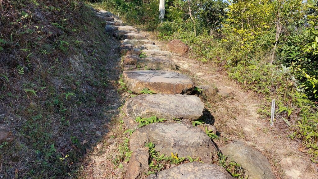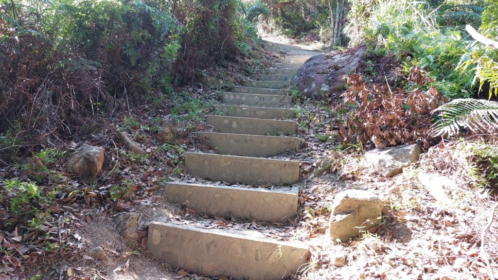 由此徐徐下走,經過一段較陰暗的水泥路,便要開始急降下山。這段下坡路斜度甚高,且是暗斜的水泥路,甚是難行。部分更長有苔蘚,如是潮濕天甚是濕滑,好在斜坡旁還有部分破舊的石階可供行走。在下山途中,便見象山轟立在側。此山岩石外露,形態剛強,猶如一道屏障般守護著大澳。 沿徑一直下降,便可抵達大澳南涌村完成鳳凰徑第六段的行程。