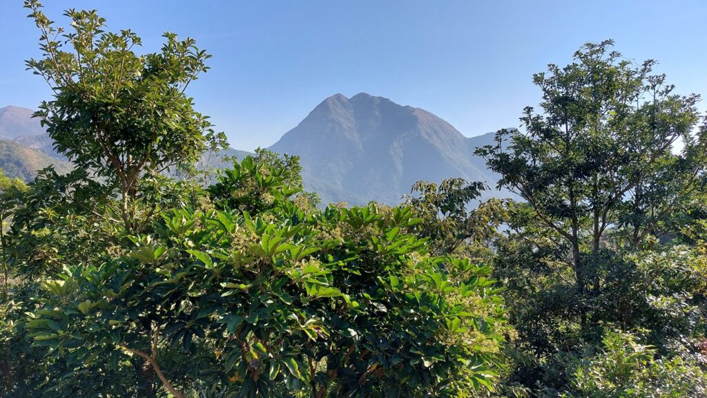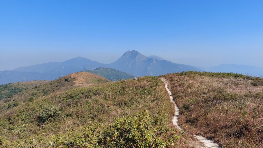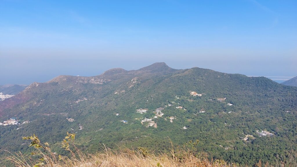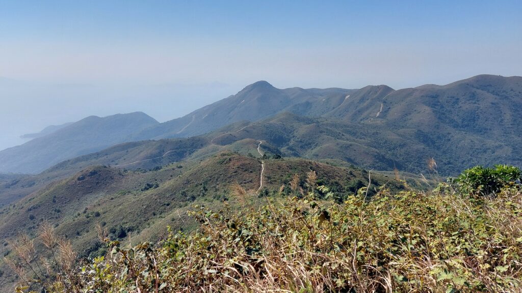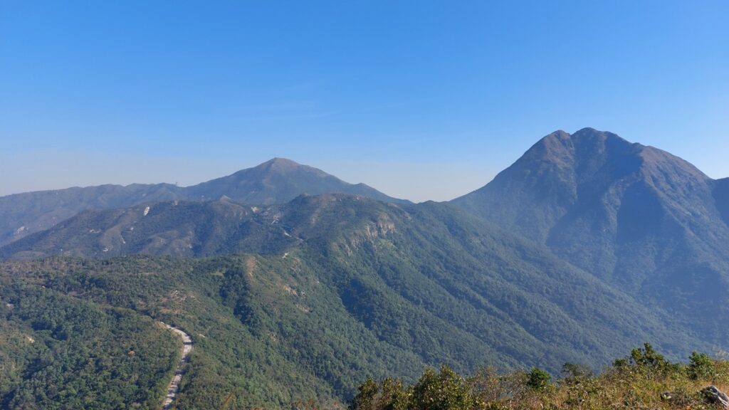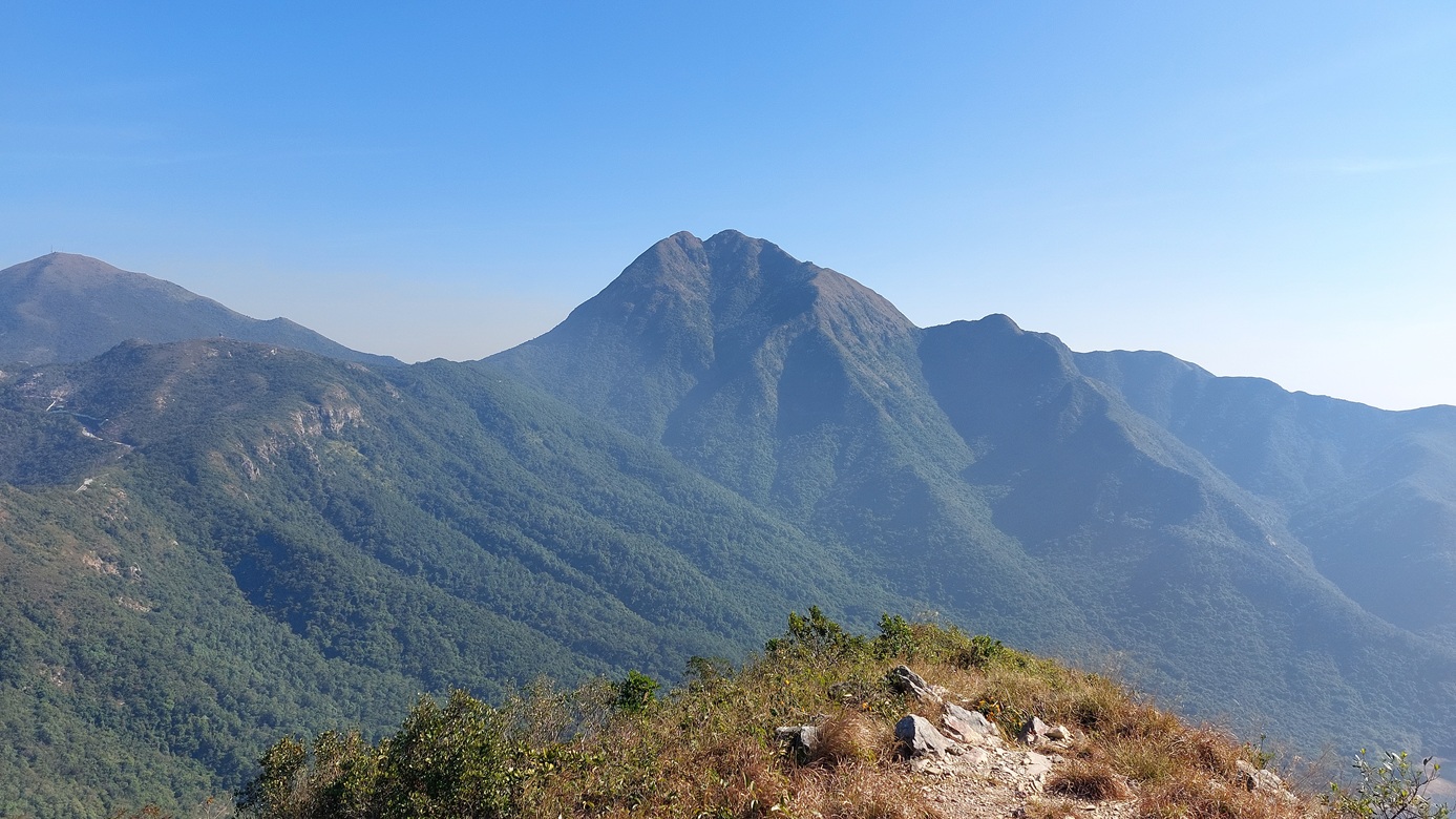 這是在觀音山頂拍到的鳳凰山。險峻陡峭的山峰和山脊稜角分明,氣勢非凡。攀登鳳凰山頂峰、中狗牙、西狗牙、一樹坡脊的路徑都極陡斜險峻難行,是行山者挑戰的熱門目標。