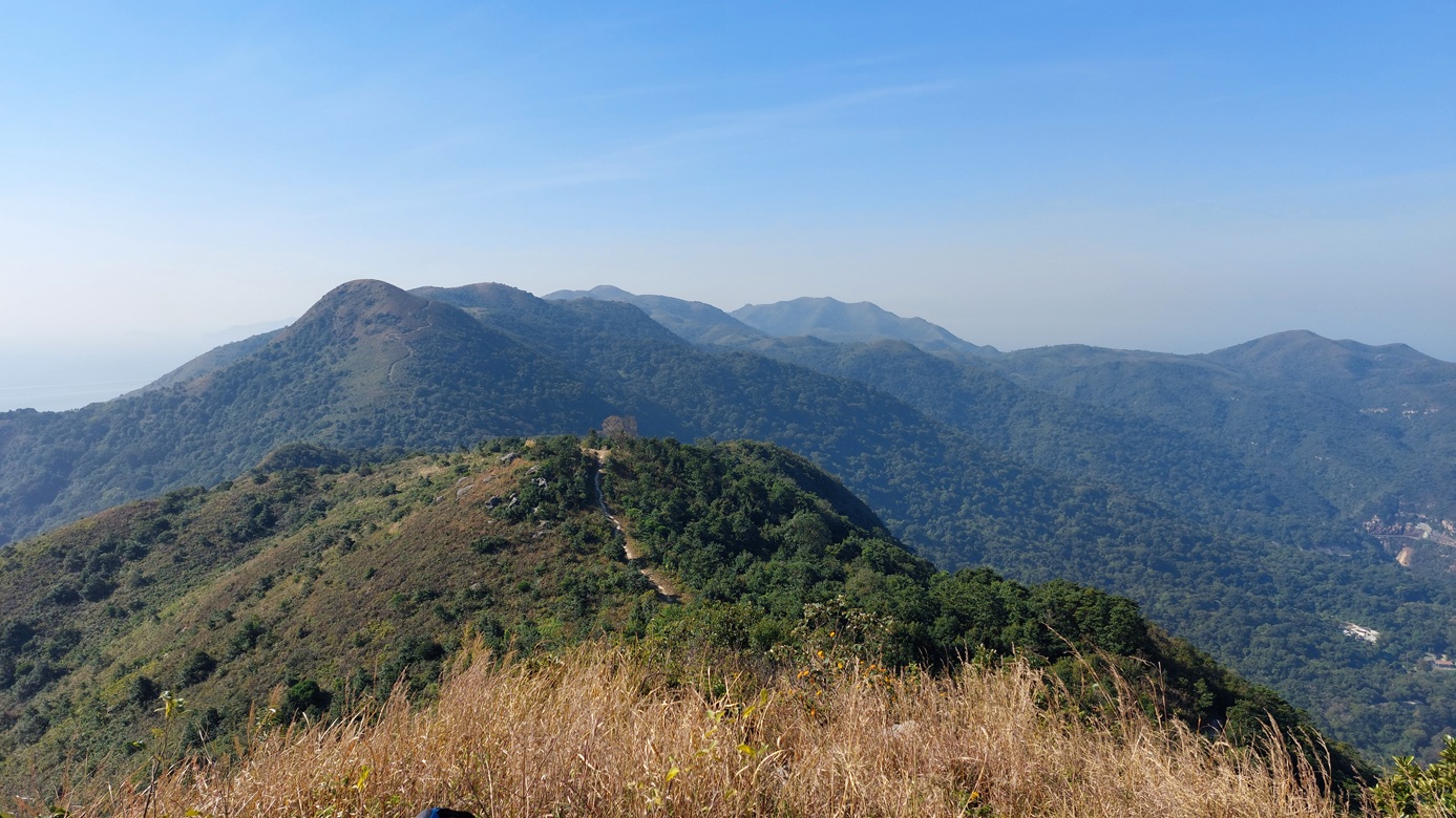 這是在觀音山頂拍到的鳳凰山。險峻陡峭的山峰和山脊稜角分明,氣勢非凡。攀登鳳凰山頂峰、中狗牙、西狗牙、一樹坡脊的路徑都極陡斜險峻難行,是行山者挑戰的熱門目標。