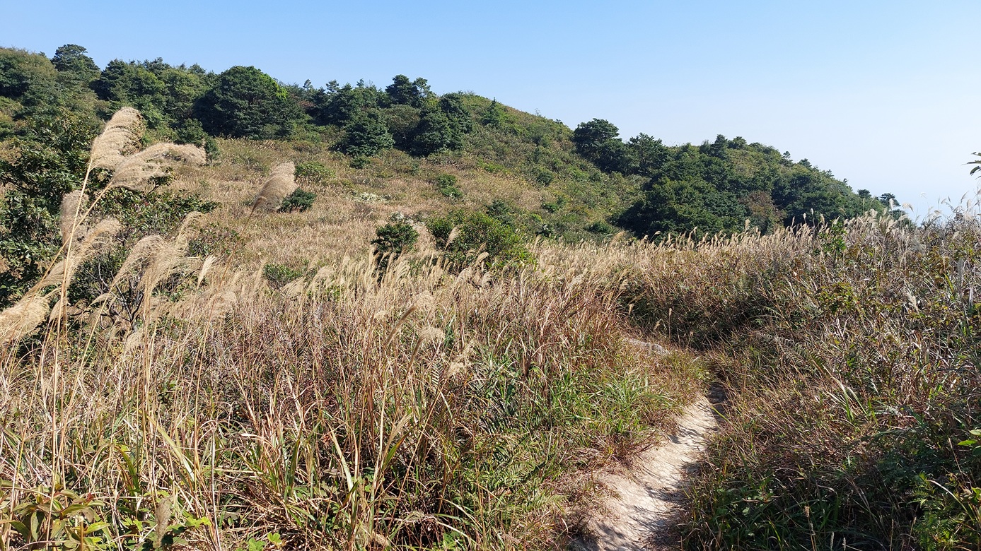 由此徐徐下走,經過一段較陰暗的水泥路,便要開始急降下山。這段下坡路斜度甚高,且是暗斜的水泥路,甚是難行。部分更長有苔蘚,如是潮濕天甚是濕滑,好在斜坡旁還有部分破舊的石階可供行走。在下山途中,便見象山轟立在側。此山岩石外露,形態剛強,猶如一道屏障般守護著大澳。 沿徑一直下降,便可抵達大澳南涌村完成鳳凰徑第六段的行程。