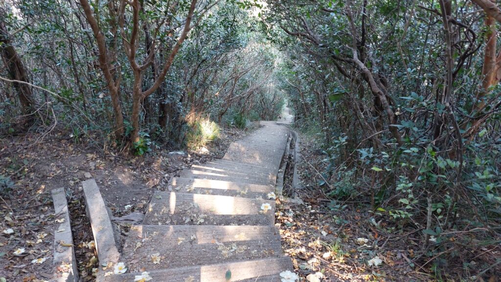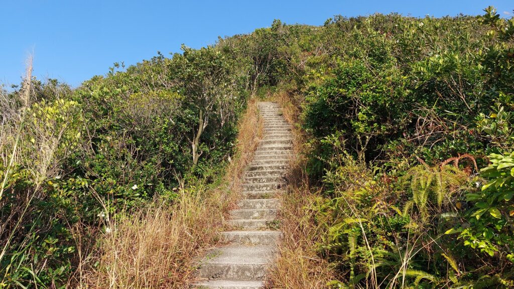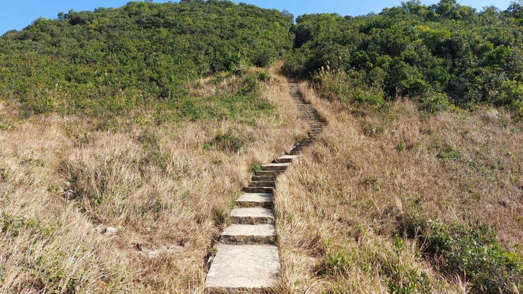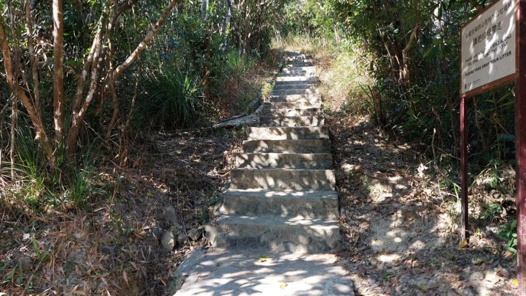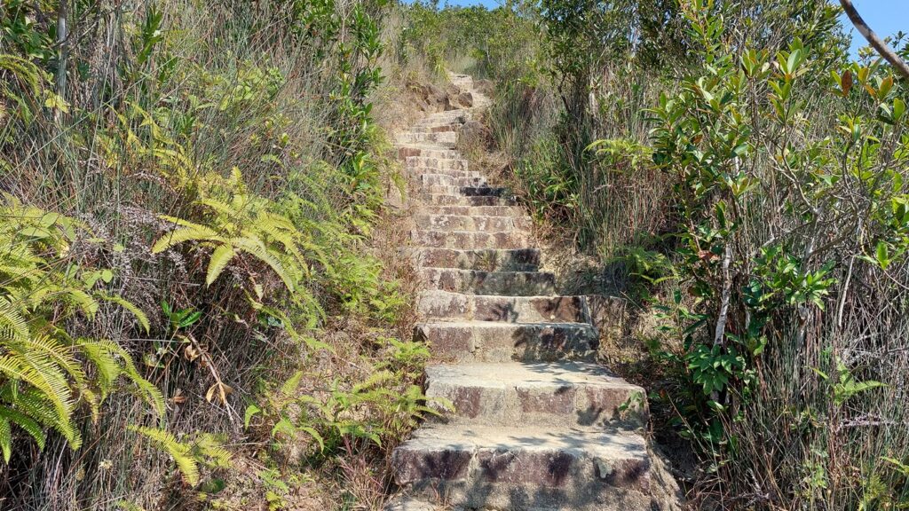 沿石級上攀紫羅蘭山,又一個長上坡。到紫羅蘭山頂,前面岔口右轉,依著山徑下降,便可下走至陽明山莊,至衛奕信徑第一段終點。