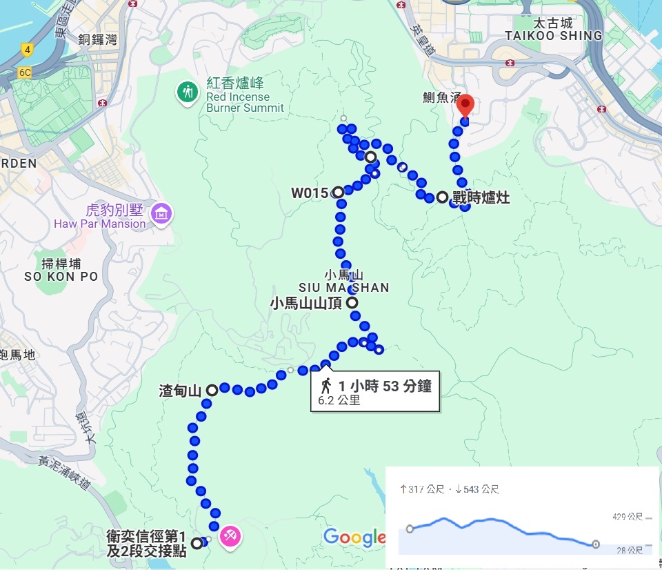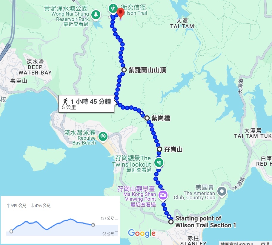 - 路線:赤柱峽道➡孖崗山➡紫羅蘭山➡陽明山莊➡渣甸山➡小馬山➡鰂魚湧