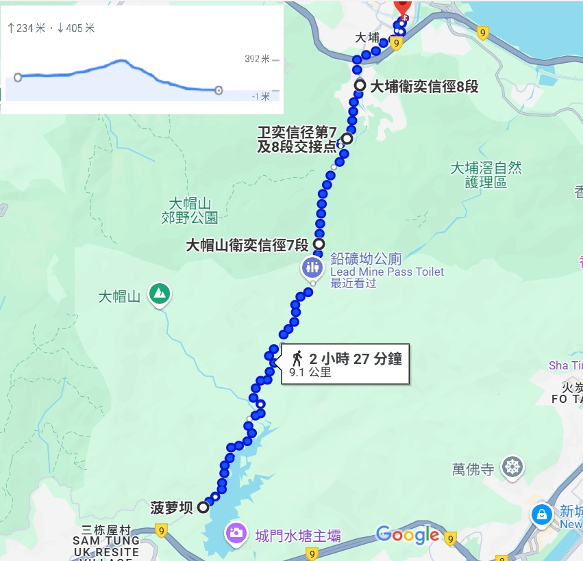 - 路線︰ 菠蘿壩➡城門水塘大壩➡鉛礦坳➡元墩下➡大埔墟站