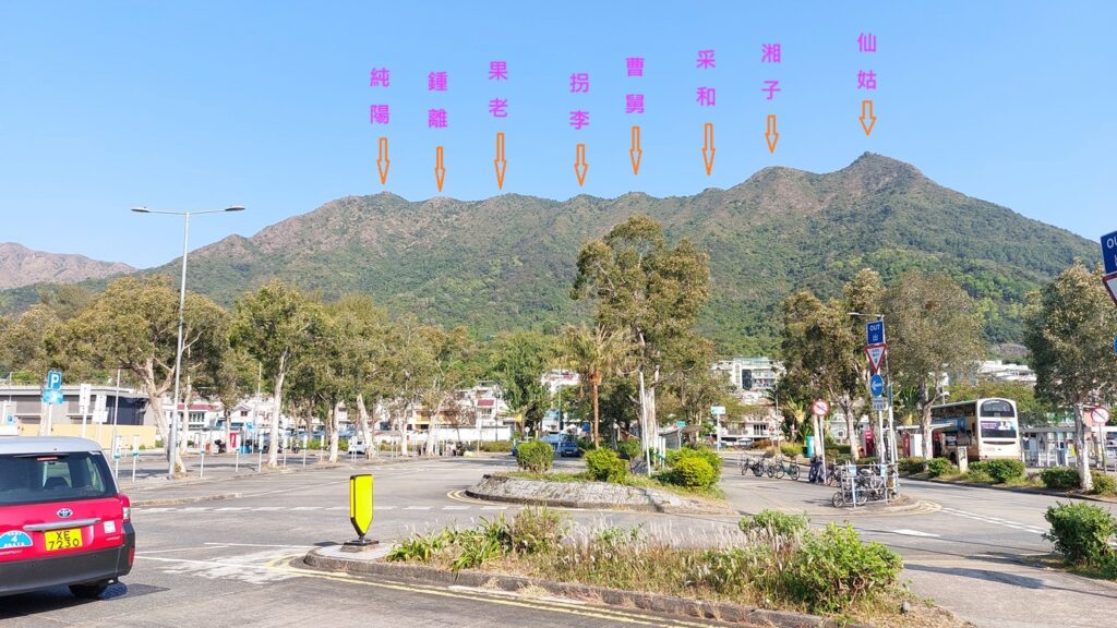 仙姑峰是八仙最東山峰,景觀最靚,可飽覽船灣淡水湖及三門仔等地,還可看到許多名山——蚺蛇尖,石屋山,雞公山,馬鞍山,大老山,獅子山,大肚山,草山,大帽山,雞公嶺,大刀屻,九龍坑山。自此一直沿八仙嶺的稜線西行,上上落落,途經仙姑(511m)、湘子(513m)、采和(489 m)、曹舅(508m)、拐李(522m)、果老(543m)、鍾離(529m)及純陽(590m)八峰。上落八峰間路程不長,但很陡峭,注意安全。