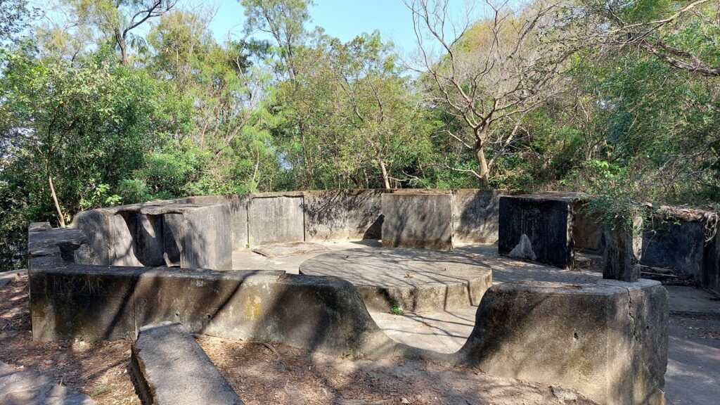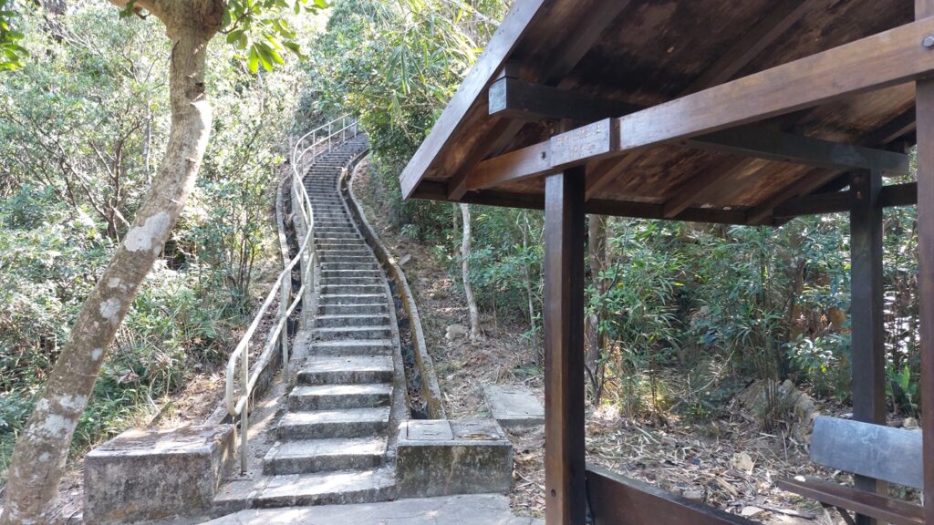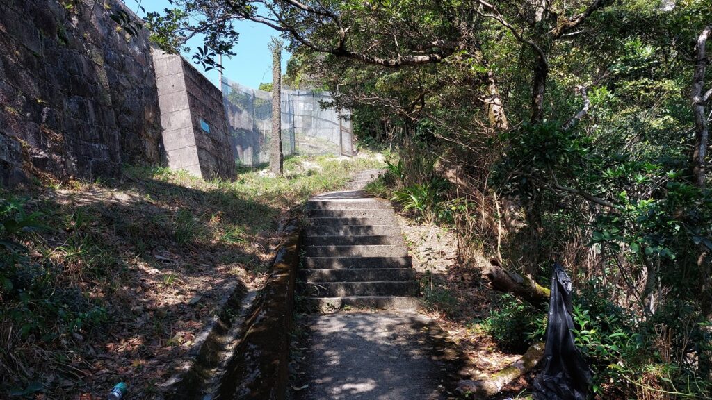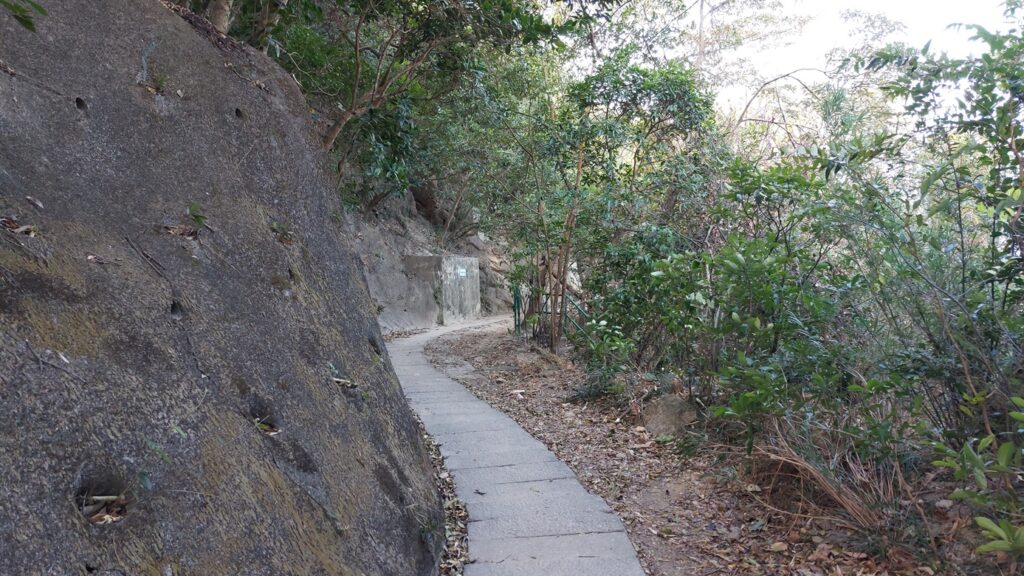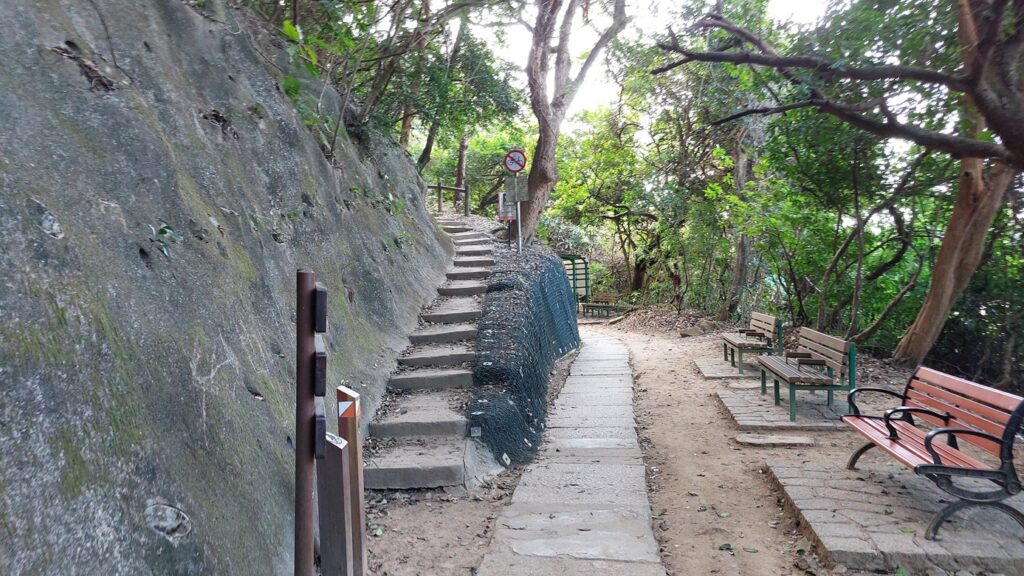 漫長的上坡是本程最辛苦的一段,且上山路徑分岔較多,多看地圖。沿徑攀升。經1號涼亭至廁所處,往龍虎山頂。再前行經3號涼亭及松林砲台,後轉入克頓道,直至夏力道和盧吉道環廻處,休息。(如有興致可在此順道登西高山)