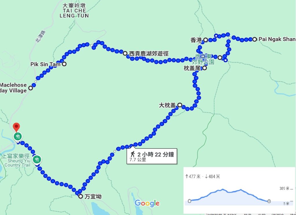 - 路線︰ 上窰➡萬宜凹➡大枕蓋➡牌額山➡鹿湖郊遊徑➡碧扇潭➡渡假村