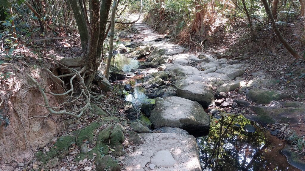苗三古道,樹蔭下,石塊路,極具韻味。古道沿途山澗伴隨,時而踏石而過,時而越過小橋。風聲,水流聲,鳥鳴聲,似音樂般。寧靜的古道,行來甚是享受;