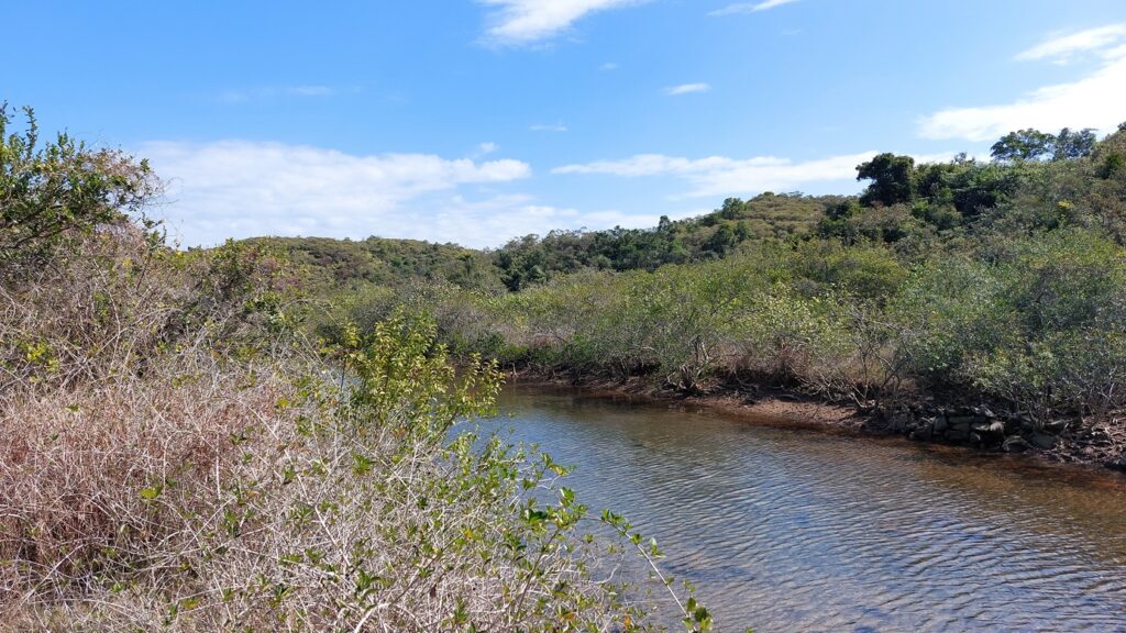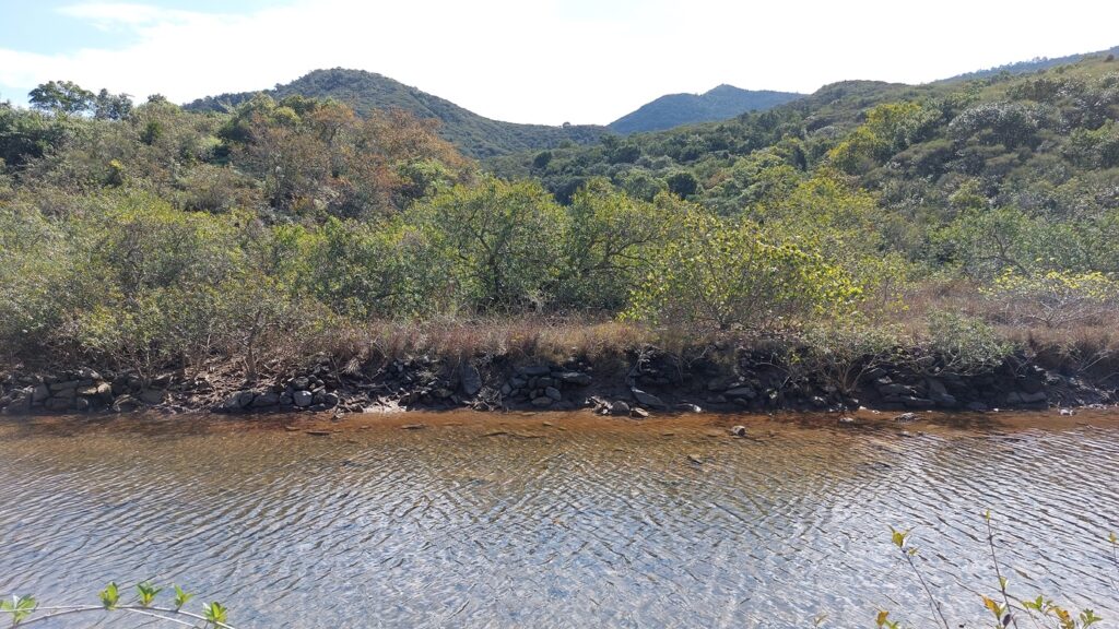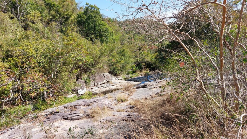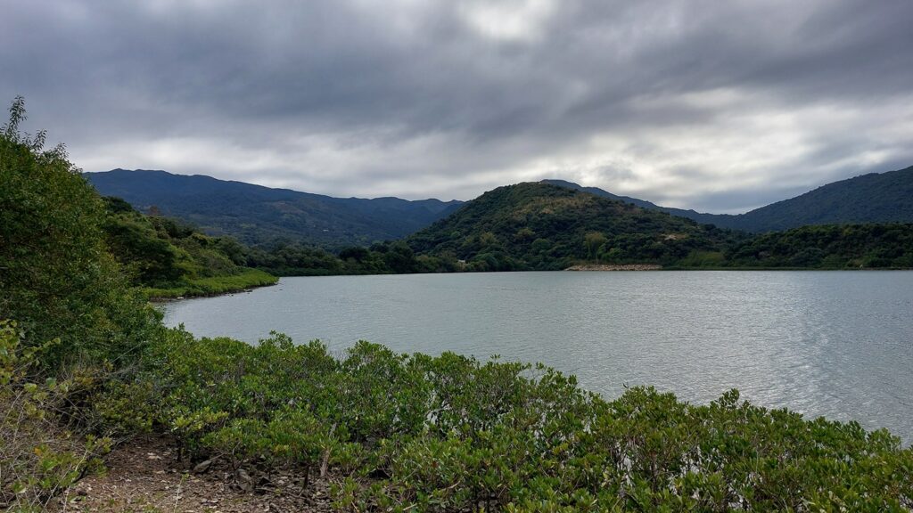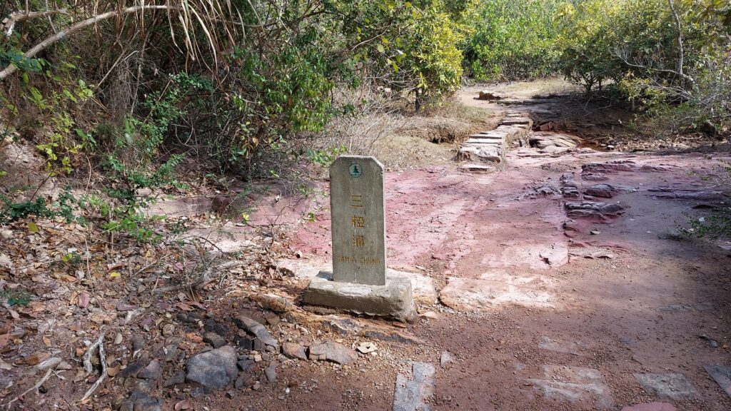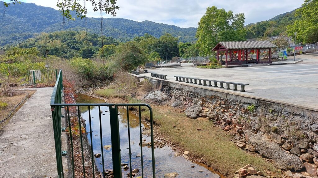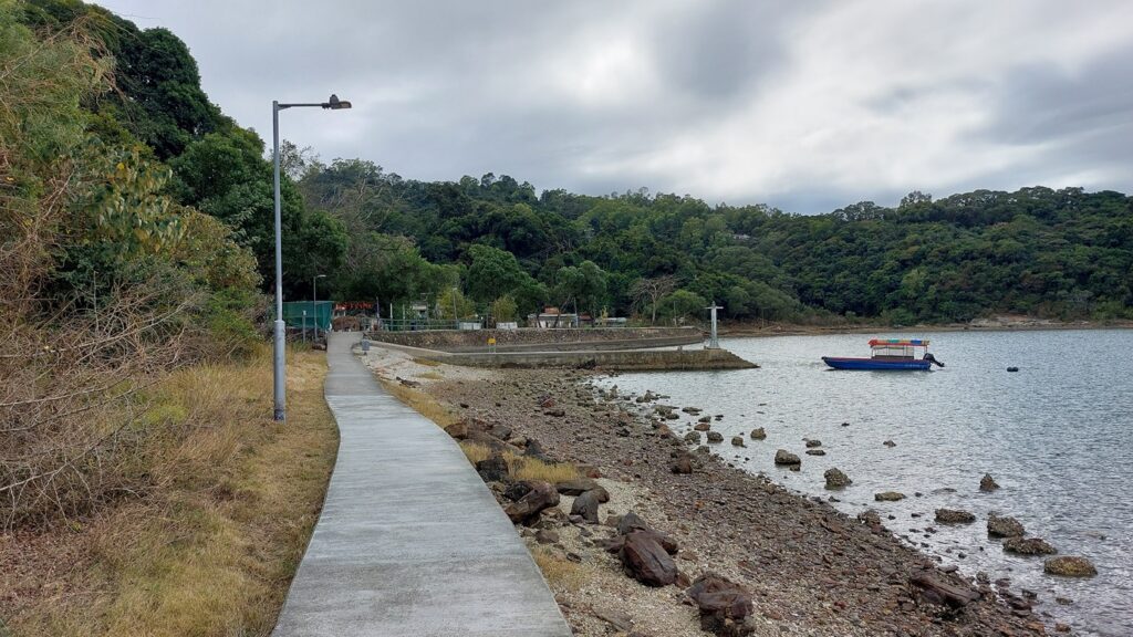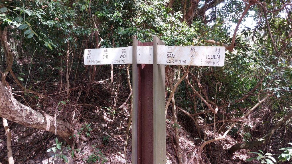 十字路口依指示先往三椏碼頭打卡,返回往荔枝窩方向,至三椏公廁。這有岔路可往西流江,本次往荔枝窩。沿路微上山坡,後下落小灘,續沿河邊堤岸走,分岔口右往荔枝窩(左走蛤塘)。