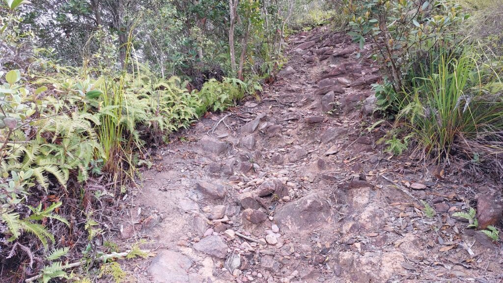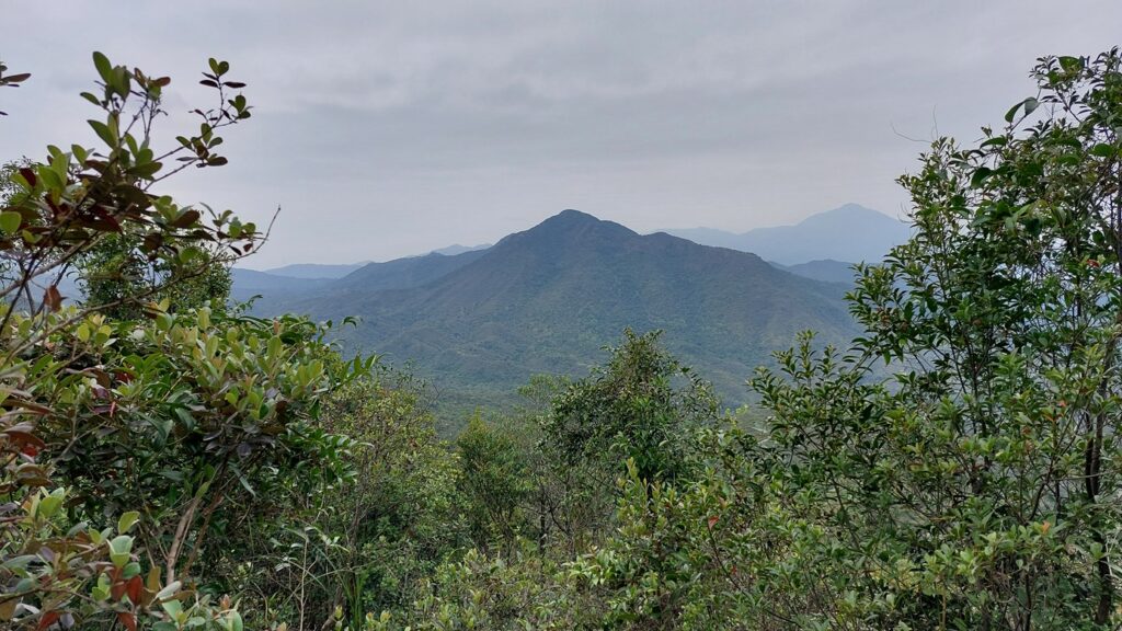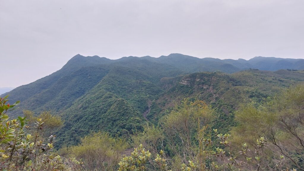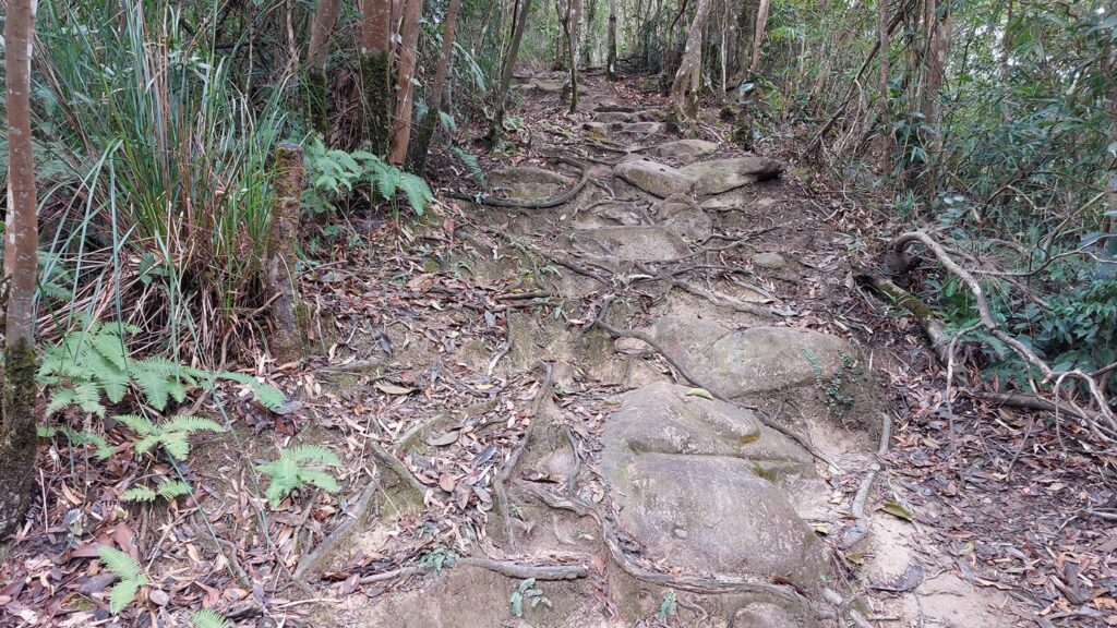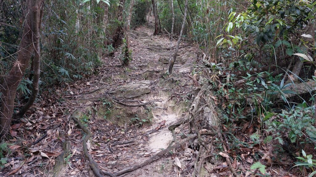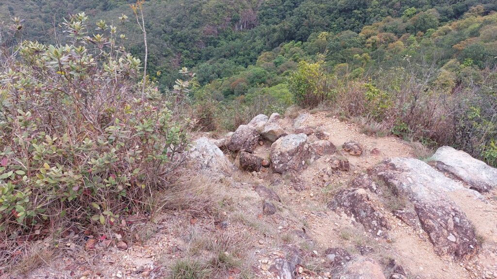 先攀上馬頭峰,經赤馬頭、雞仔峒、橫嶺頭、大峒、觀音峒、石芽頭,行至鹿湖峒坳頂。這段路程在山脊上,經過許多山頭,起伏大,路徑崎嶇陡峭,相當費力。