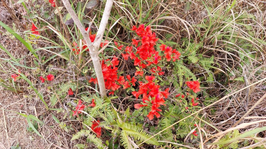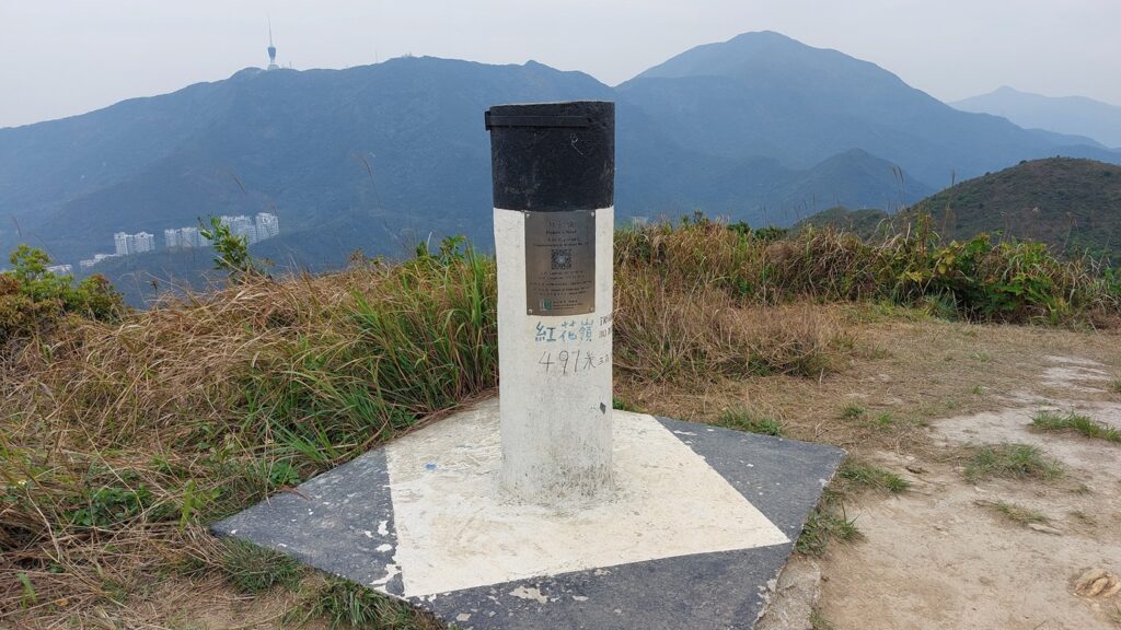 入紅花嶺郊遊徑,一段辛苦的上山徑。先攀上亞公頂,後跨越二峒和三峒。至紅花寨前的分岔口,先取右方山徑急升紅花寨(左方山徑可繞峰而行),設有紅花嶺觀景台。輕降後來到分岔路口,紅嶺郊遊徑結束於C8107,接行蓮麻郊遊徑C8205。沿蓮麻郊遊徑前行,至紅花嶺峰下,往左山徑攀上紅花嶺山頂。