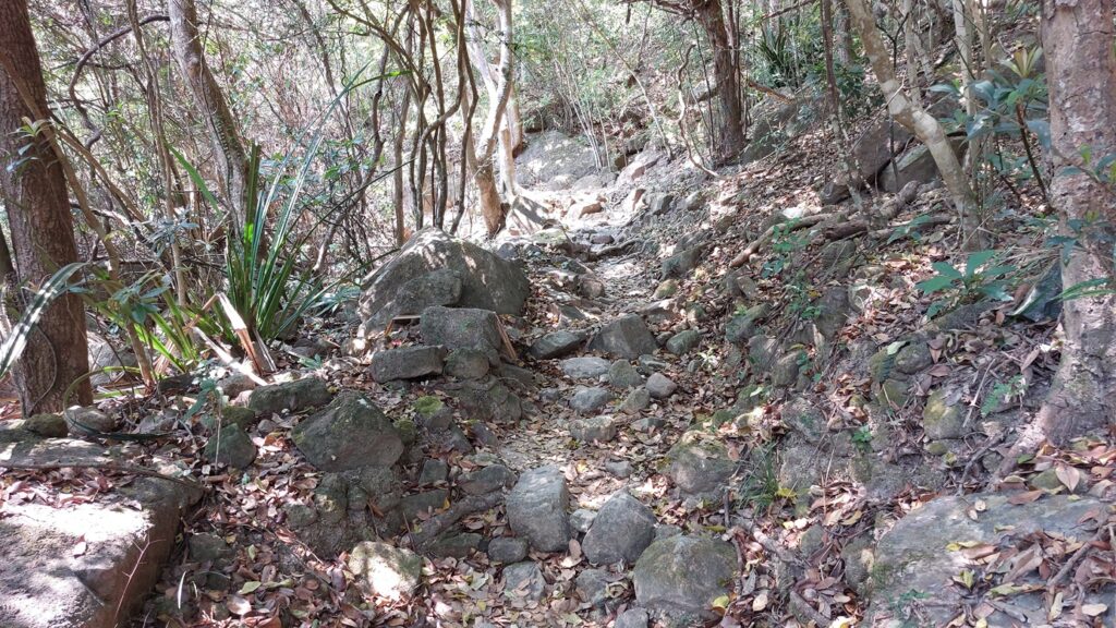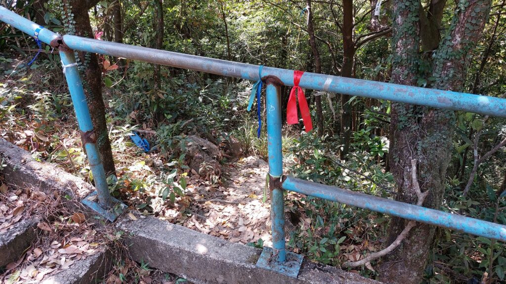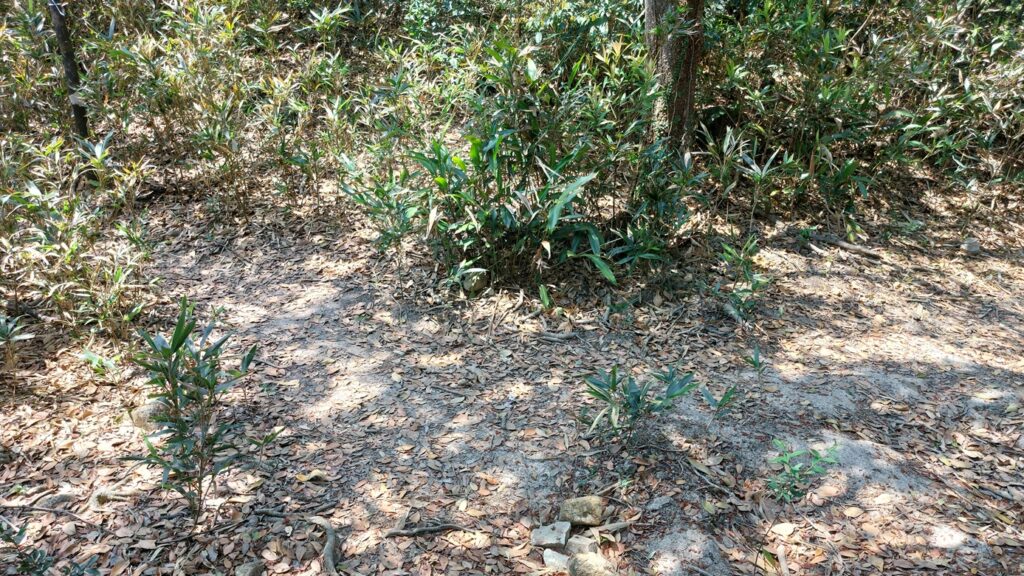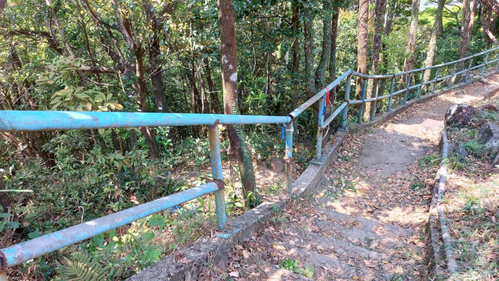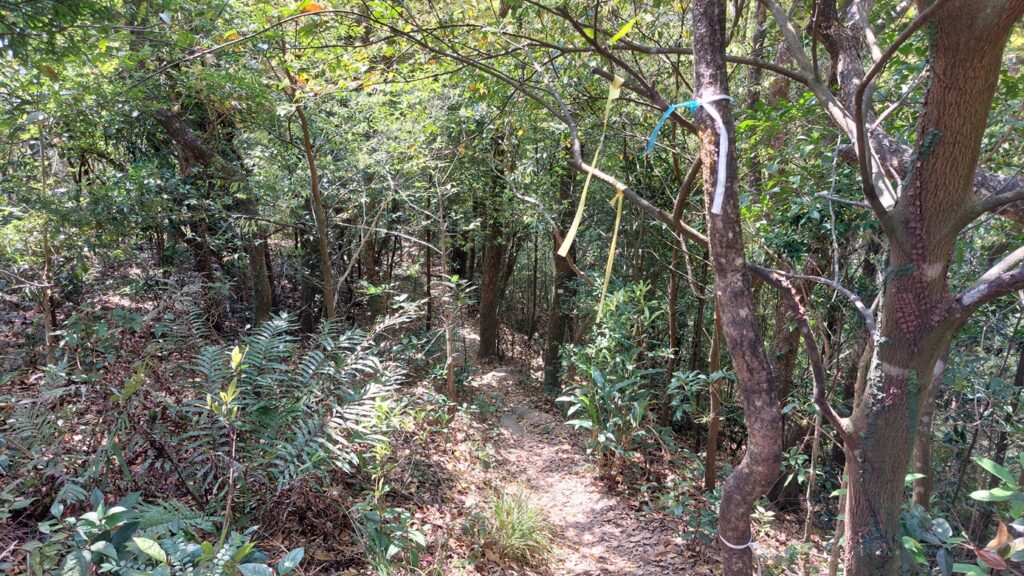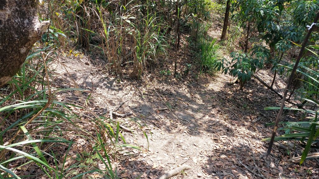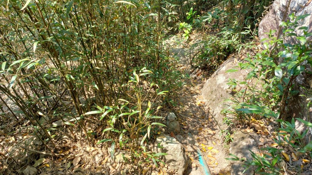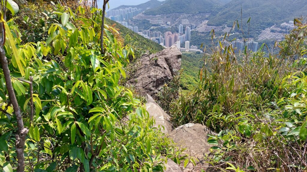 沿南脊山徑下山。下山路是條荒徑,大致向南稍偏東,向石澳方向落山。沿途路徑不太明顯,但多有絲帶指引,只有兩個岔路口,留意看離線地圖也不易迷路。