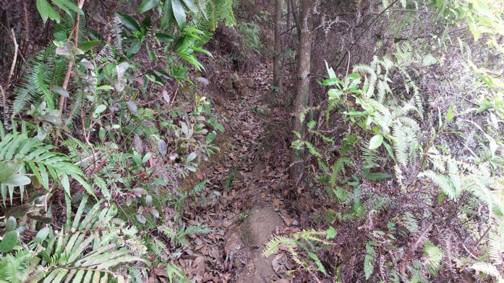 行來不易。攀上太墩及雷打石山較陡峭崎嶇,登岩頭山則行草叢茂密的林中荒徑。最難的路段,是落雷打石山,近乎垂直而下,太斜了,沿徑攀爬向下,有些危險。