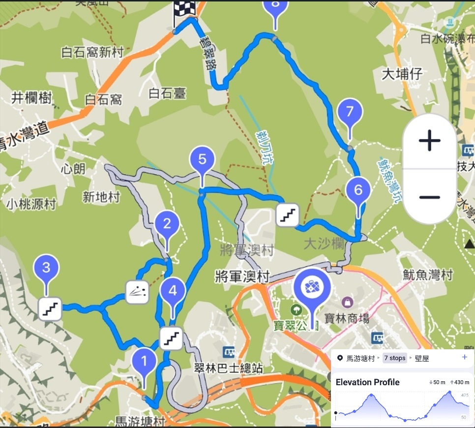 - 路線︰ 馬游唐➡寶翠路➡W徑3 ➡涼亭➡大上托➡涼亭➡蓮苑徑➡寶坑徑➡犁嘴山➡鷓鴣山➡壁屋