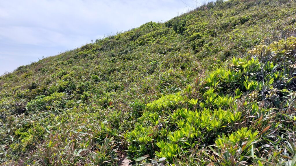 沿坡板脊上行可選擇不同難度的線路。左側較易,中間難度最大,上坡板脊需有一定的體力及膽量。攀上坡板脊後,先沿較開陽的小徑上行,後段則在茂密的樹叢中穿行,直至山頂。