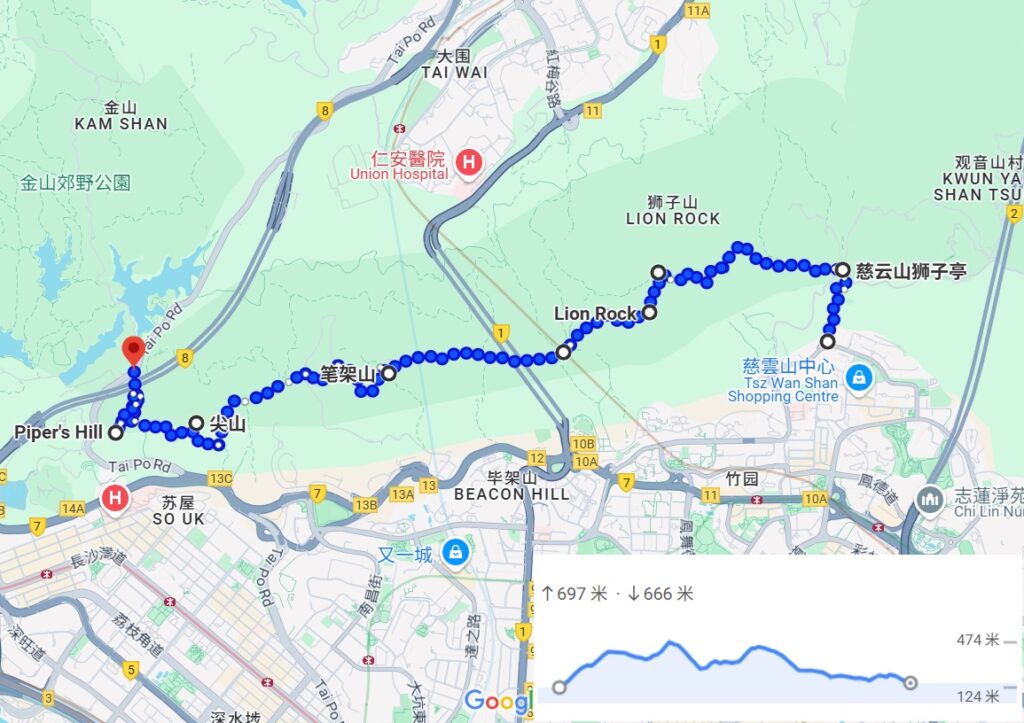 - 備註: 大致沿麥理浩徑行,途中繞登獅子山頂和尖山頂