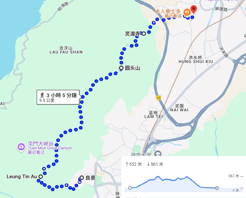 - 路線︰良景邨➡茅園山➡乾山➡圓頭山➡靈渡寺➡田廈路