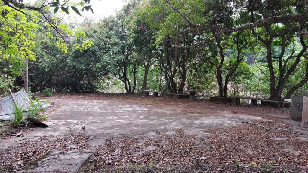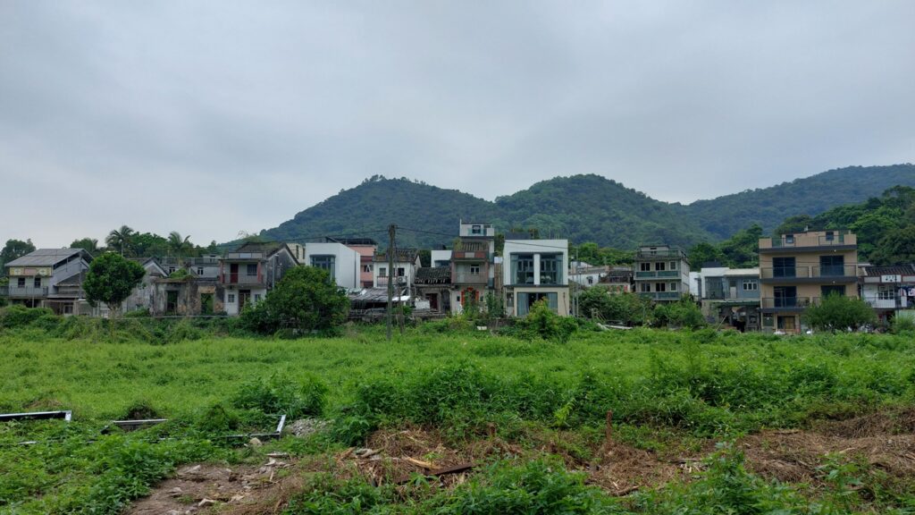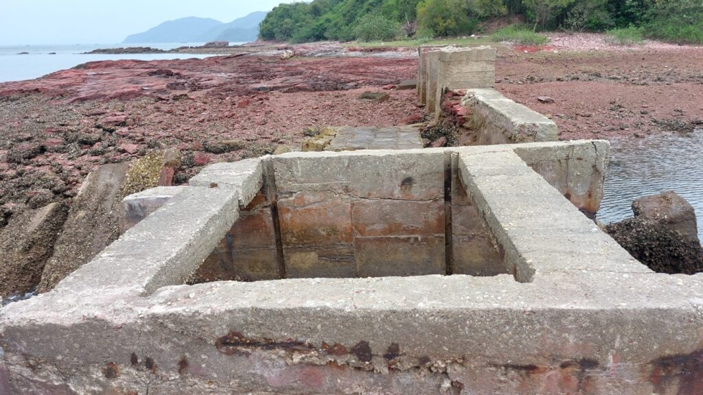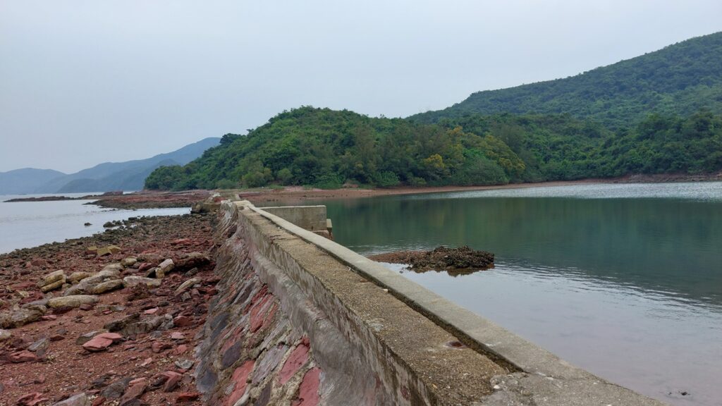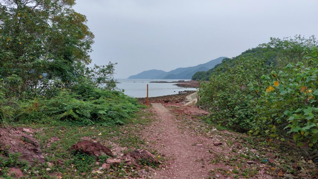 過觀音峒後不久,快至紅石門坳時,留意左邊有絲帶的隱蔽小徑往紅石門。此後沿徑下落,經吉澳水塘,至水泥路的紅石門廢村,沿水泥路行至海邊。