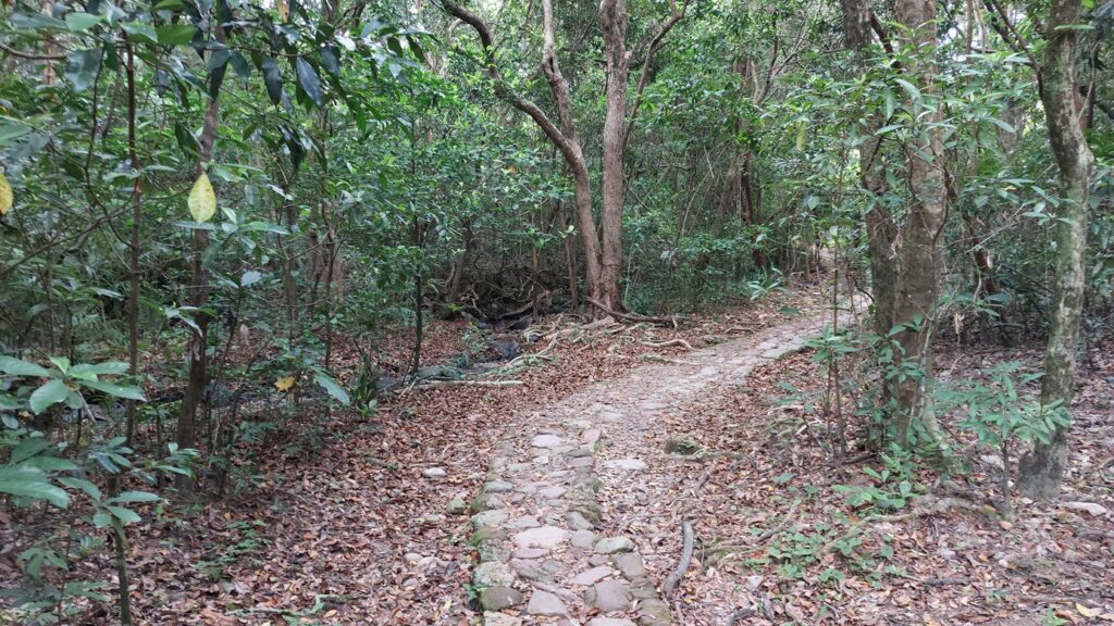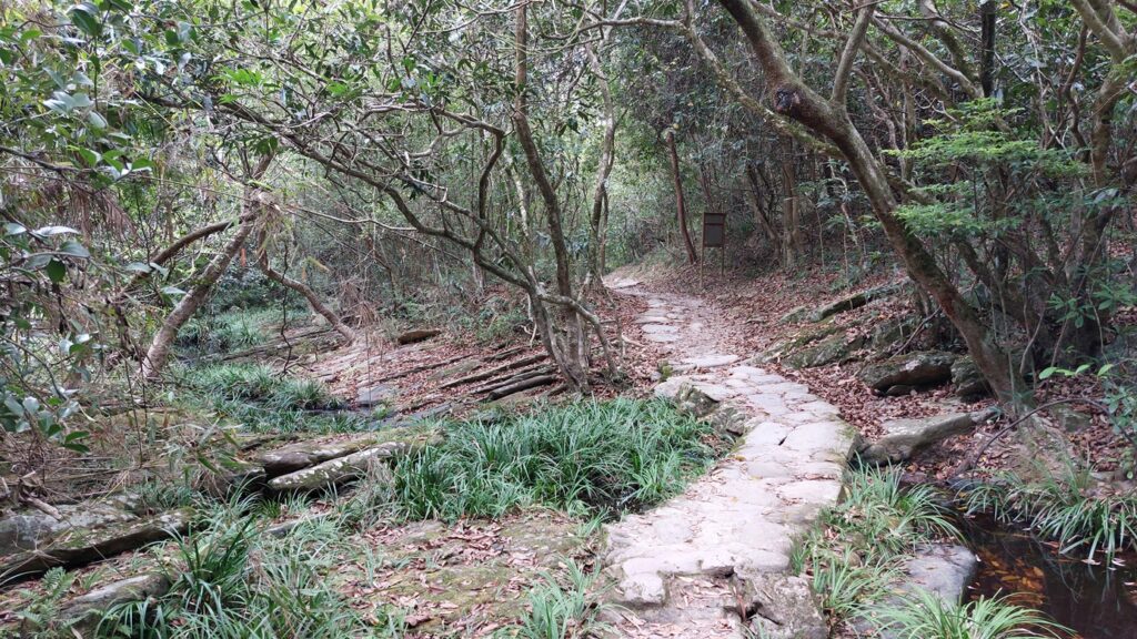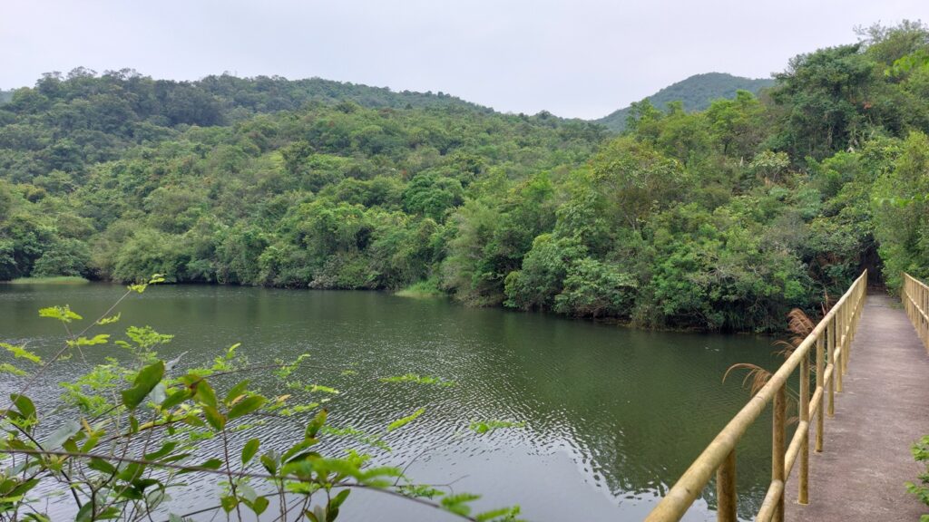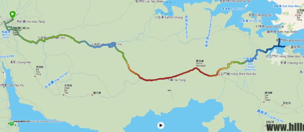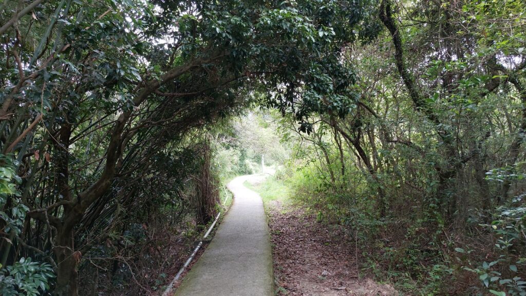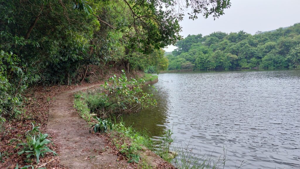 烏蛟騰落車,沿苗三古道前行,至下苗田石澗大石板標示牌處,轉右上山直至大峒,後沿船灣淡水湖郊遊徑前行。