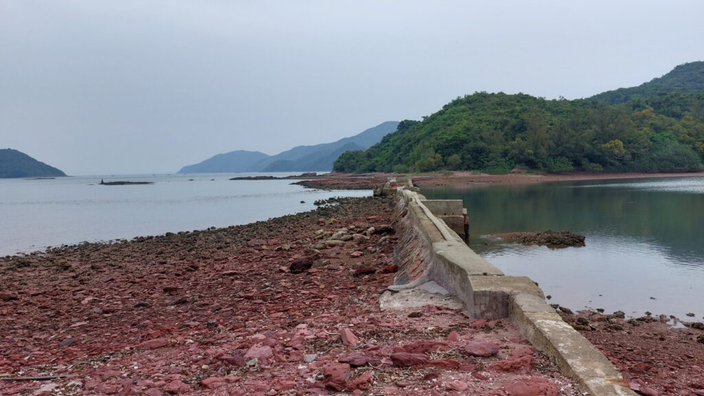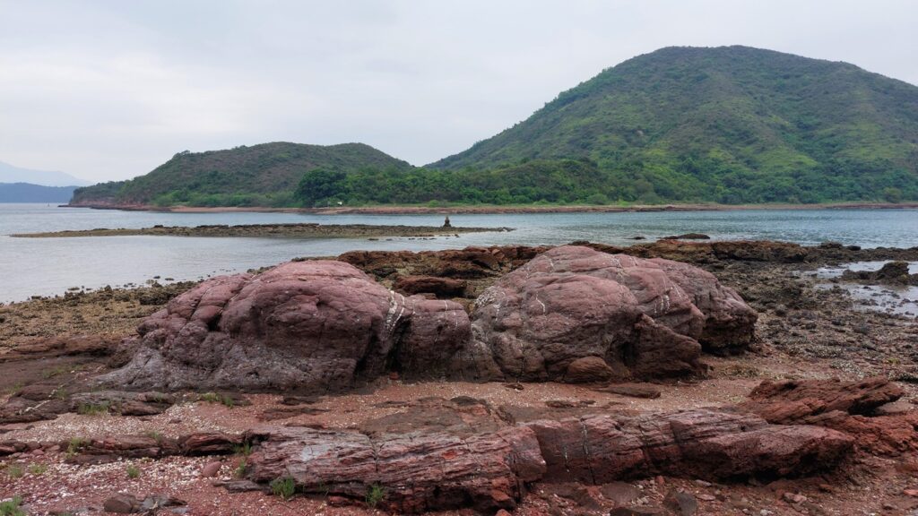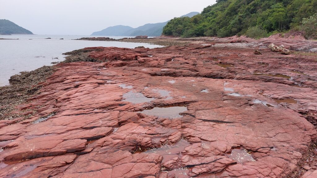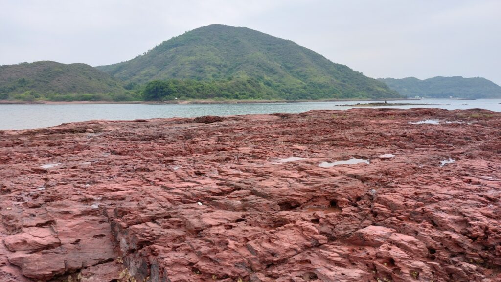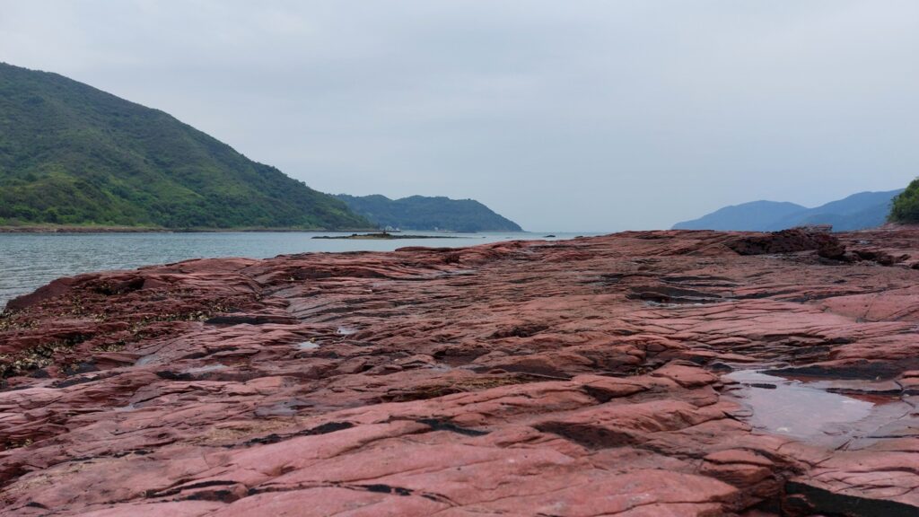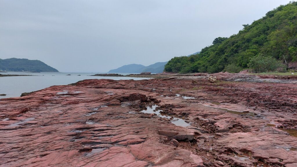 至海邊的乾門咀,海岸處處是火紅的巖石,非常醒目。對面是往灣洲,右側是紅石門灣。沿堤壩過對面,打卡後再返回。後再沿左岸前行一段,後返回。