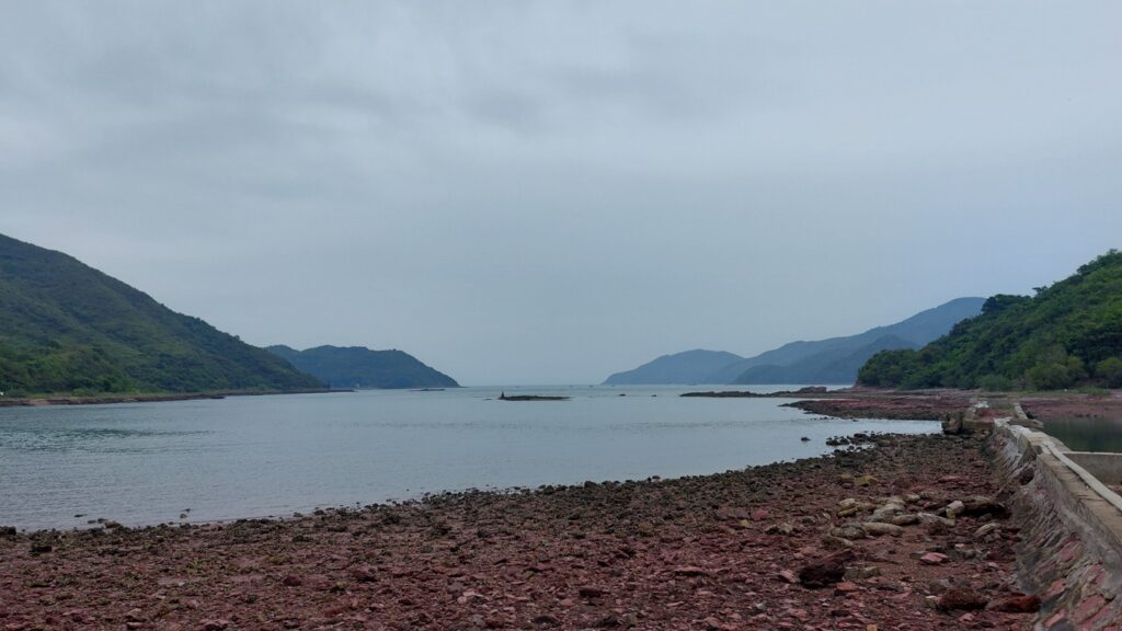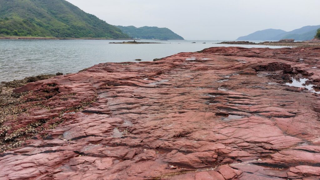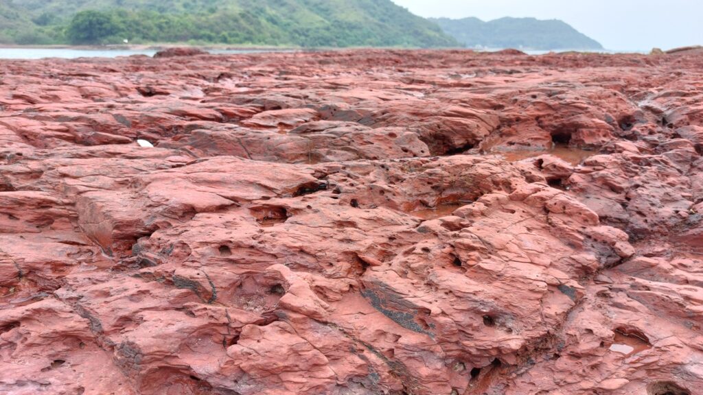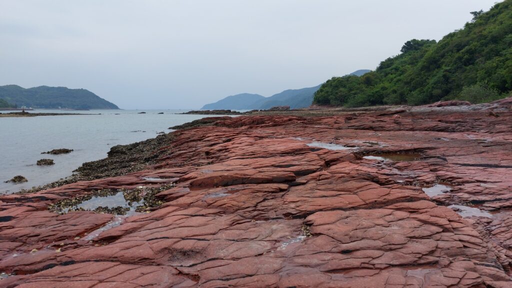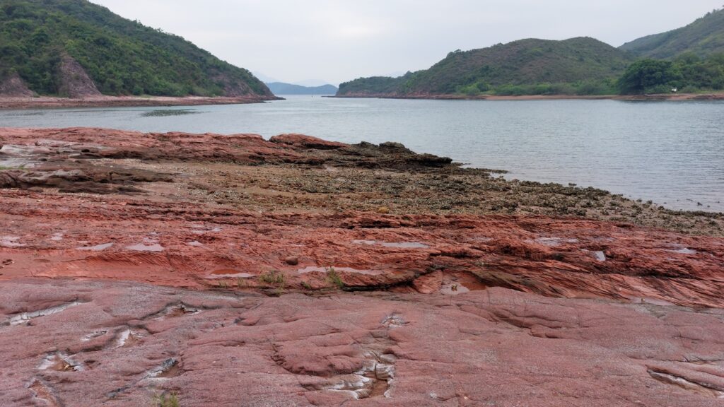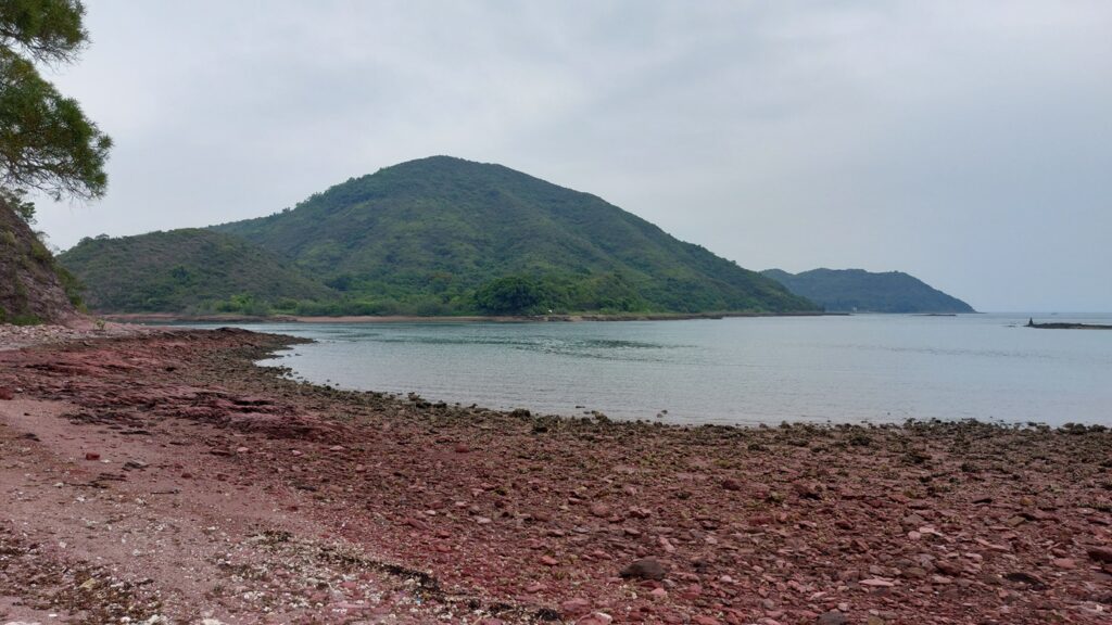 至海邊的乾門咀,海岸處處是火紅的巖石,非常醒目。對面是往灣洲,右側是紅石門灣。沿堤壩過對面,打卡後再返回。後再沿左岸前行一段,後返回。