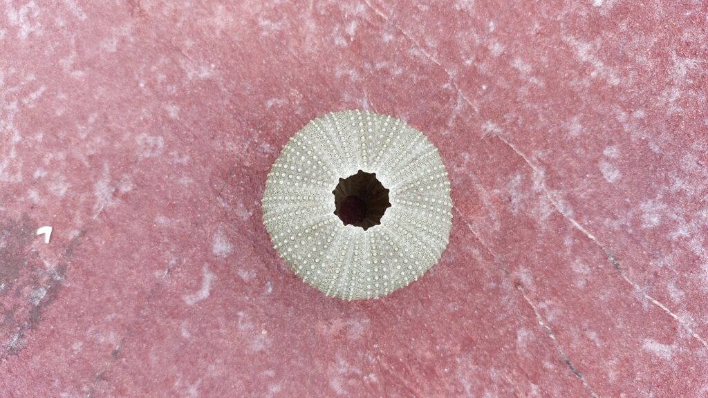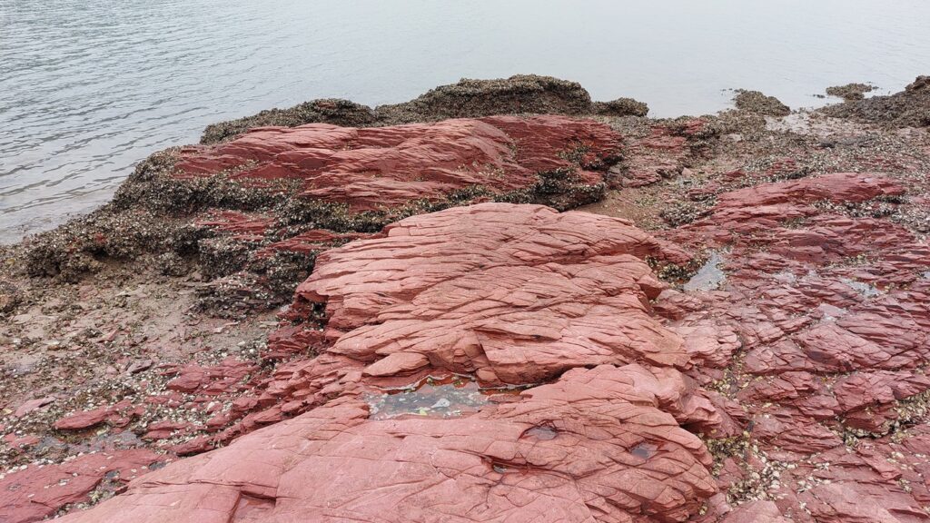 過壩觀賞紅石,真是名不虛傳。海灘,大片紅石,紅紅的顏色,形狀各異。層疊的岩塊,紋理相當豐富。當時是低潮,更顯寬大。落潮處有很多的海生動物,如螺、蟹、海膽、魷魚等。望著這獨特的美景,行程的辛苦早跑光了。