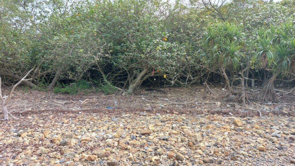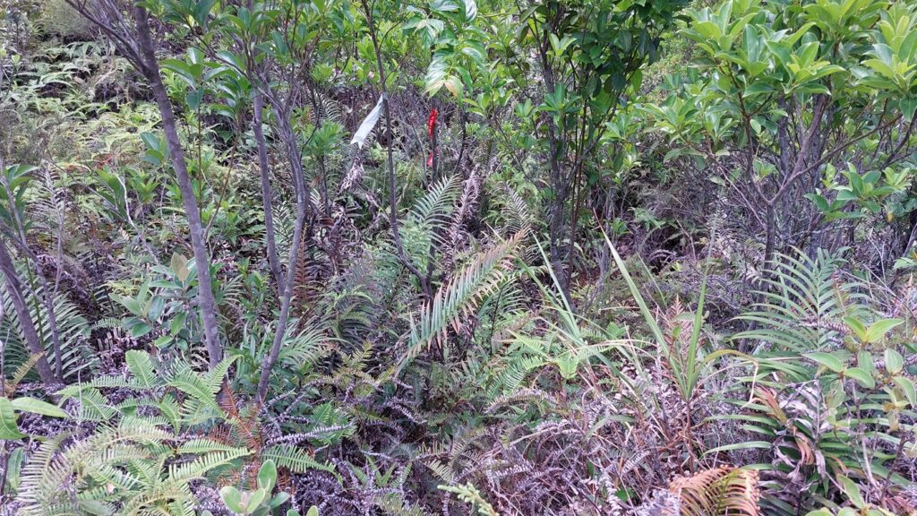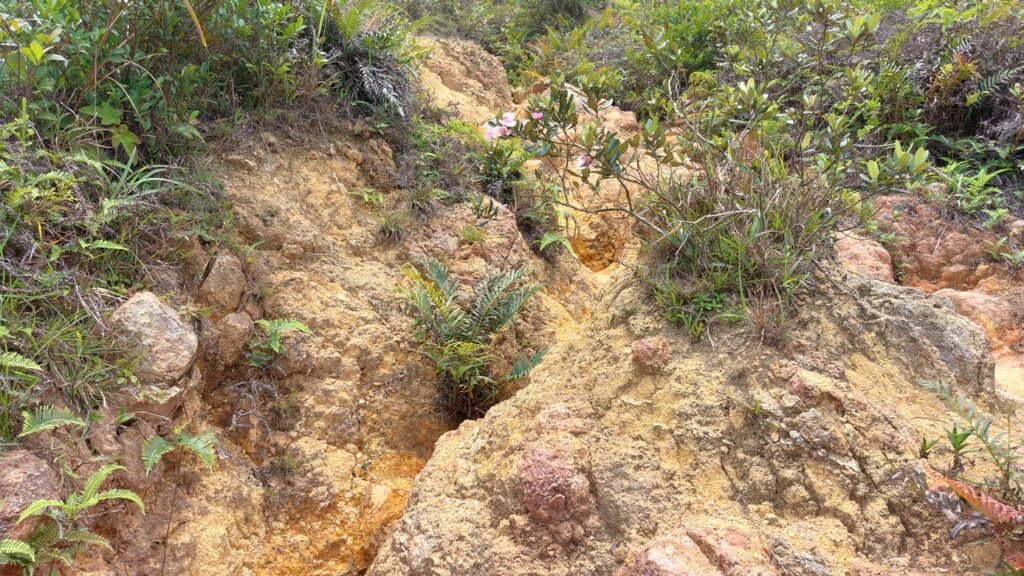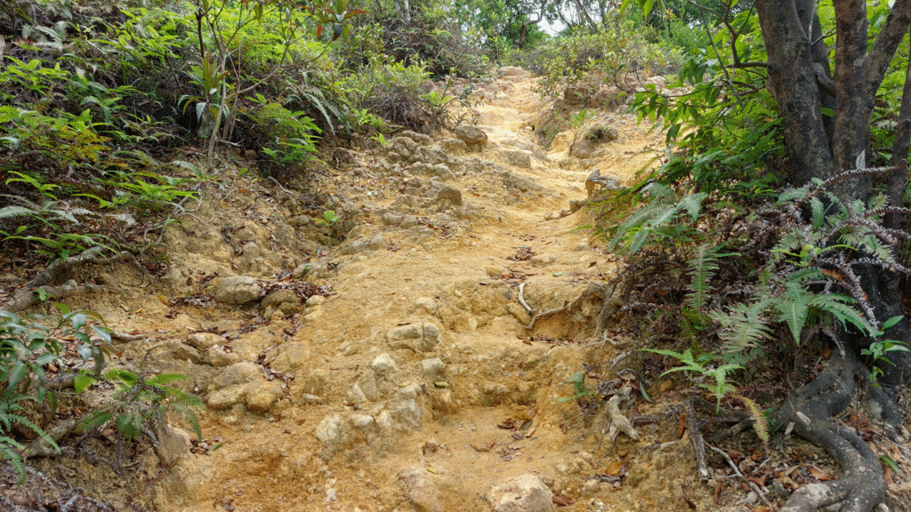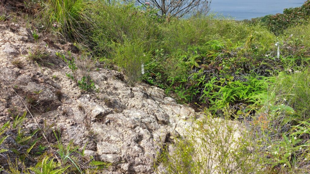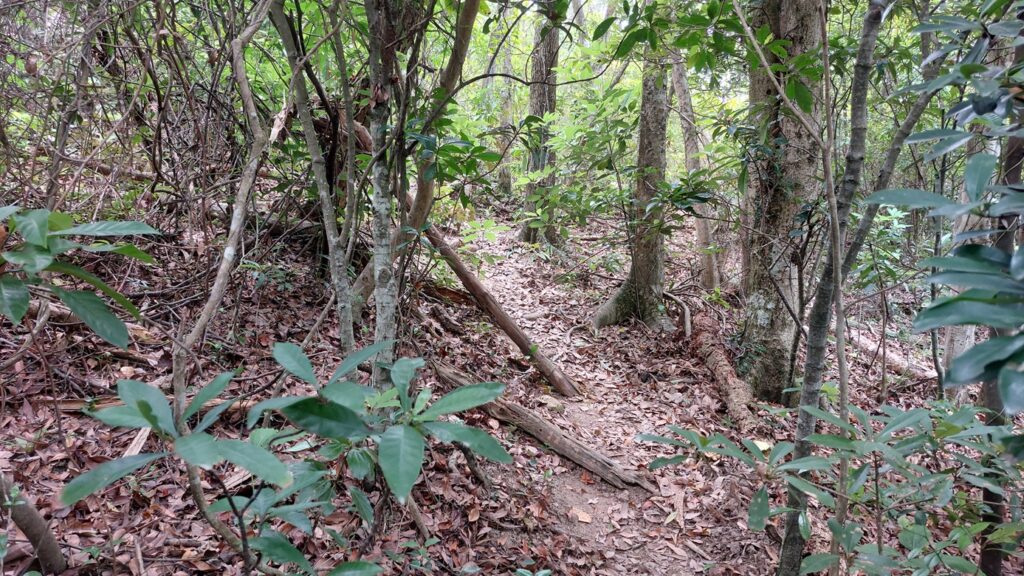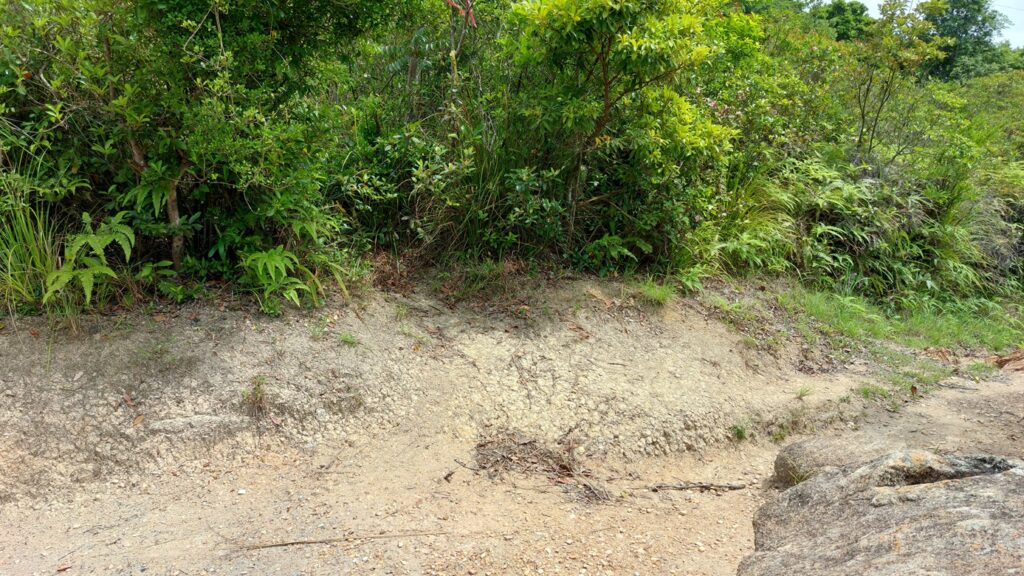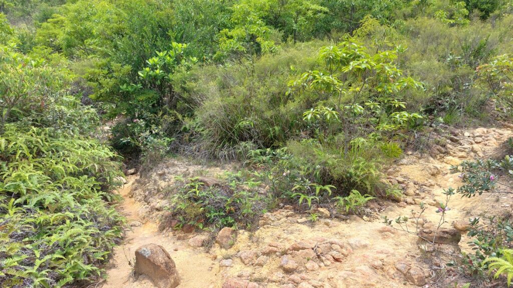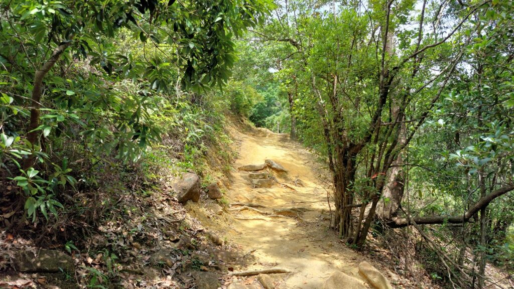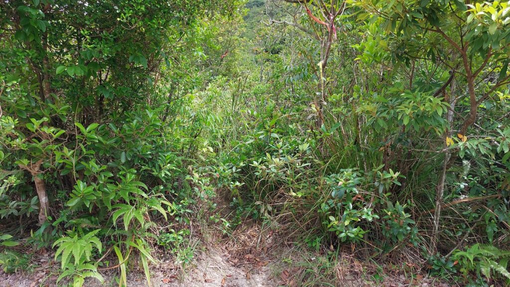 由石屋山頂至海邊下山路段長約3.2公里,荒徑,大部於灌木草叢之中。草叢茂密,路徑不易辨認;樹枝雜草縱生,阻檔前行,不時需彎腰而過,還要防止被劃傷;既要看清腳下的路,還要留意檔路的樹枝,同時還要尋找及辯認前方的路徑;全程都非常崎嶇,時有浮沙,部分更是特別陡峭,需攀爬而行。行起來實在是困難,少點體力及經驗都唔得。