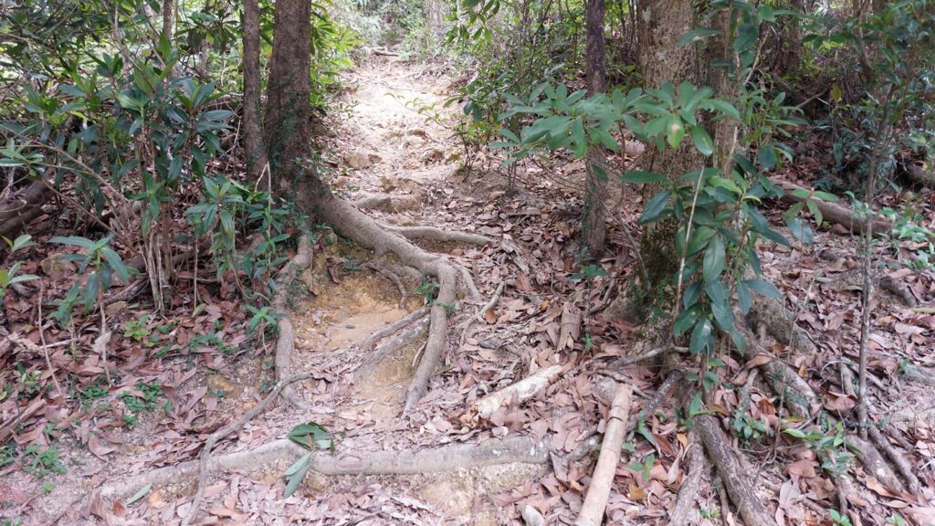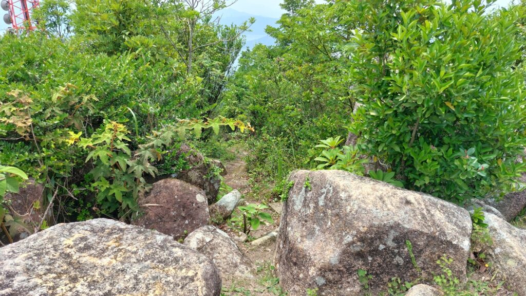 在訊號站東側的茂密小徑急降,大致沿西北方的脊線下降至蛇石坳。