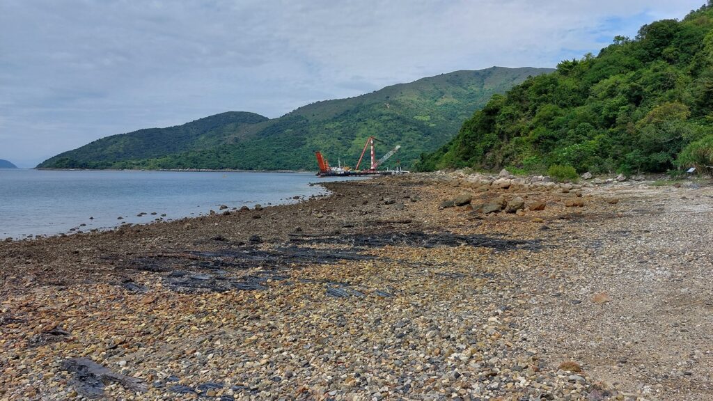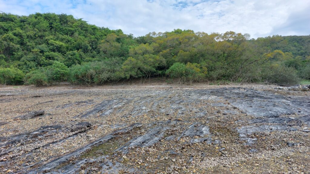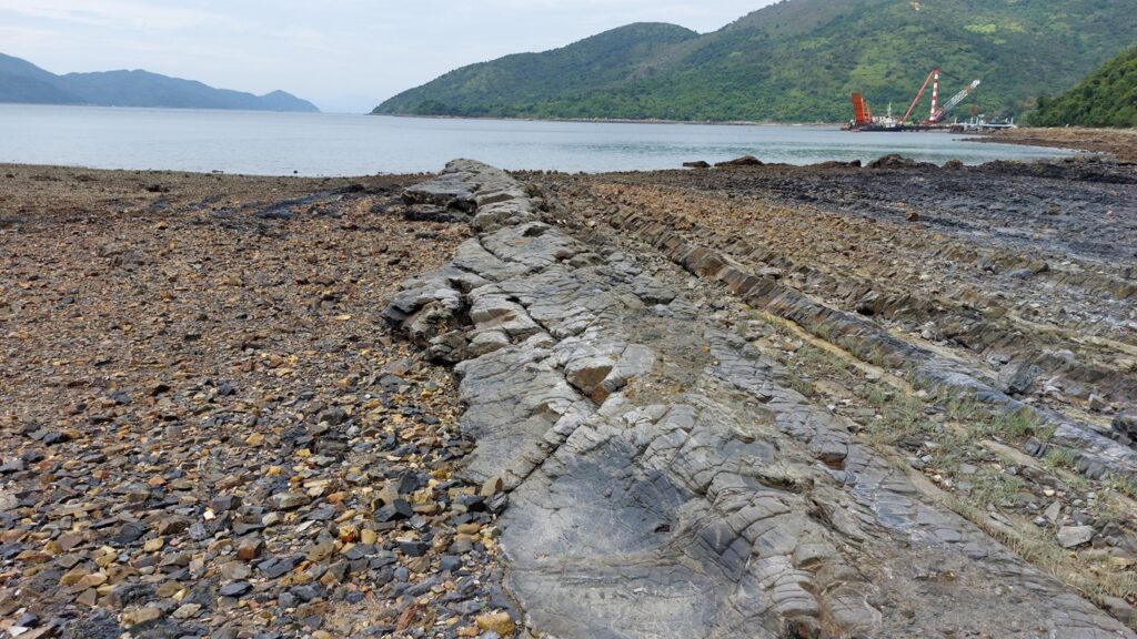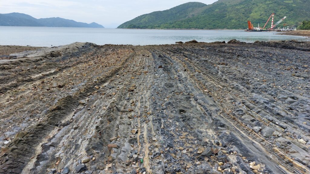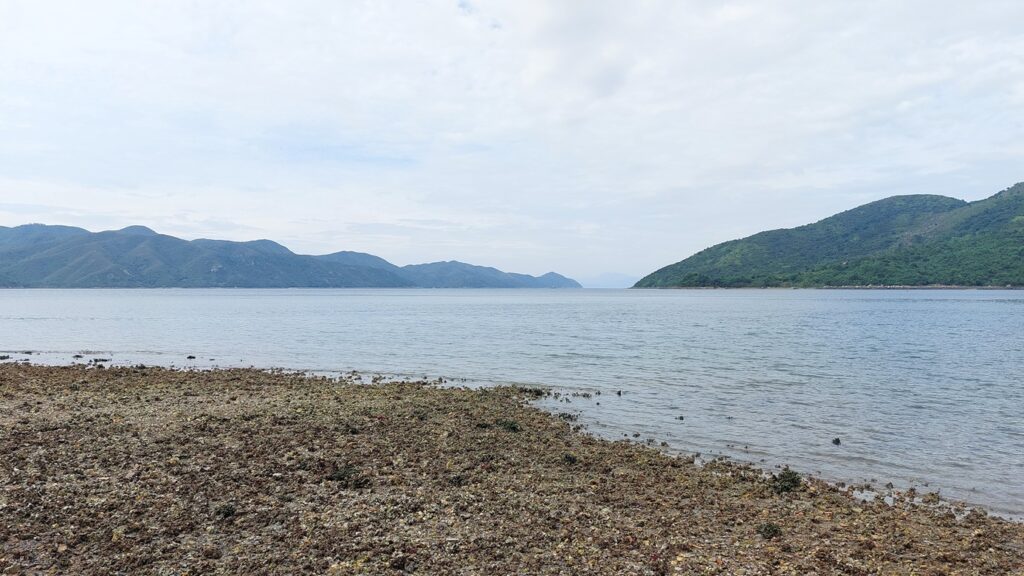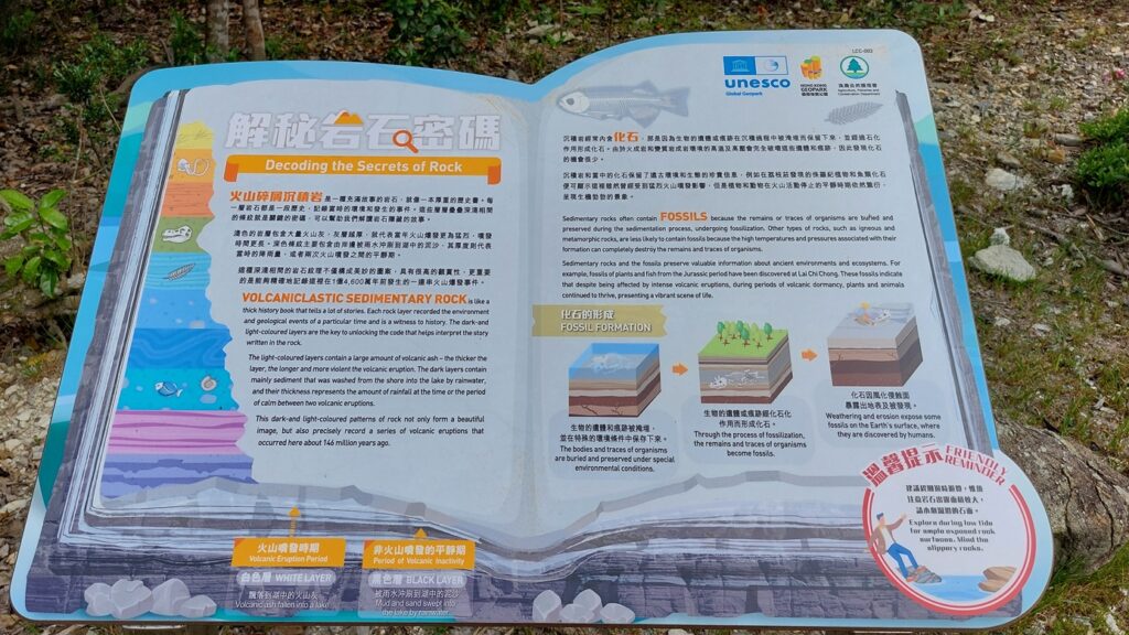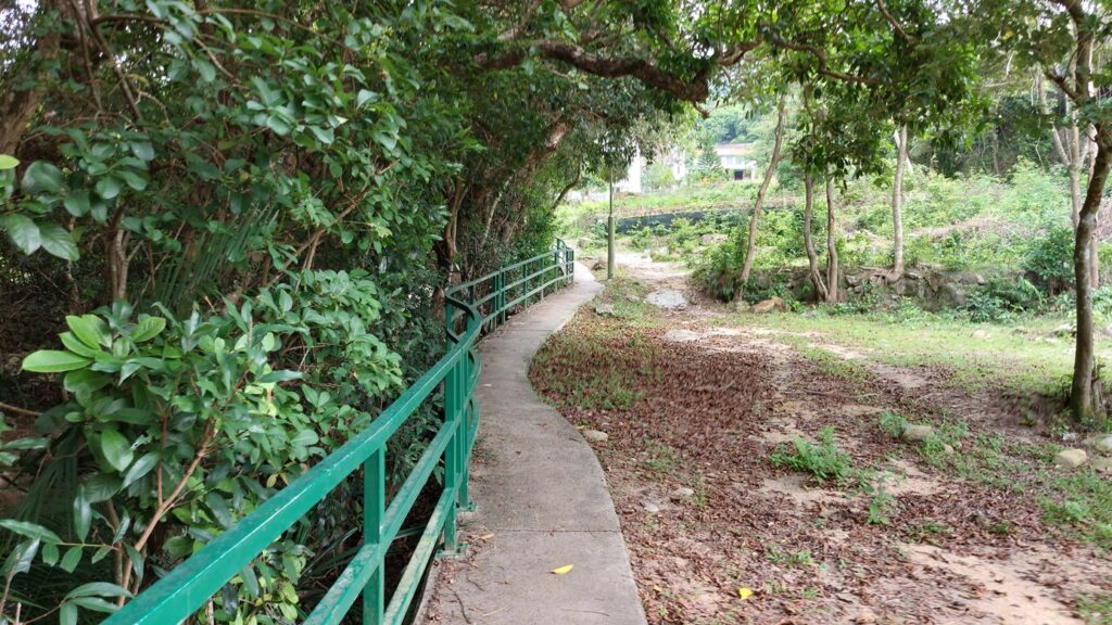 右走荔枝莊地質公園步道,欣賞黑色巖石。至碼頭後,再接水泥徑,經荔枝莊村上行,最後經南山洞走至白沙澳的海下路。
