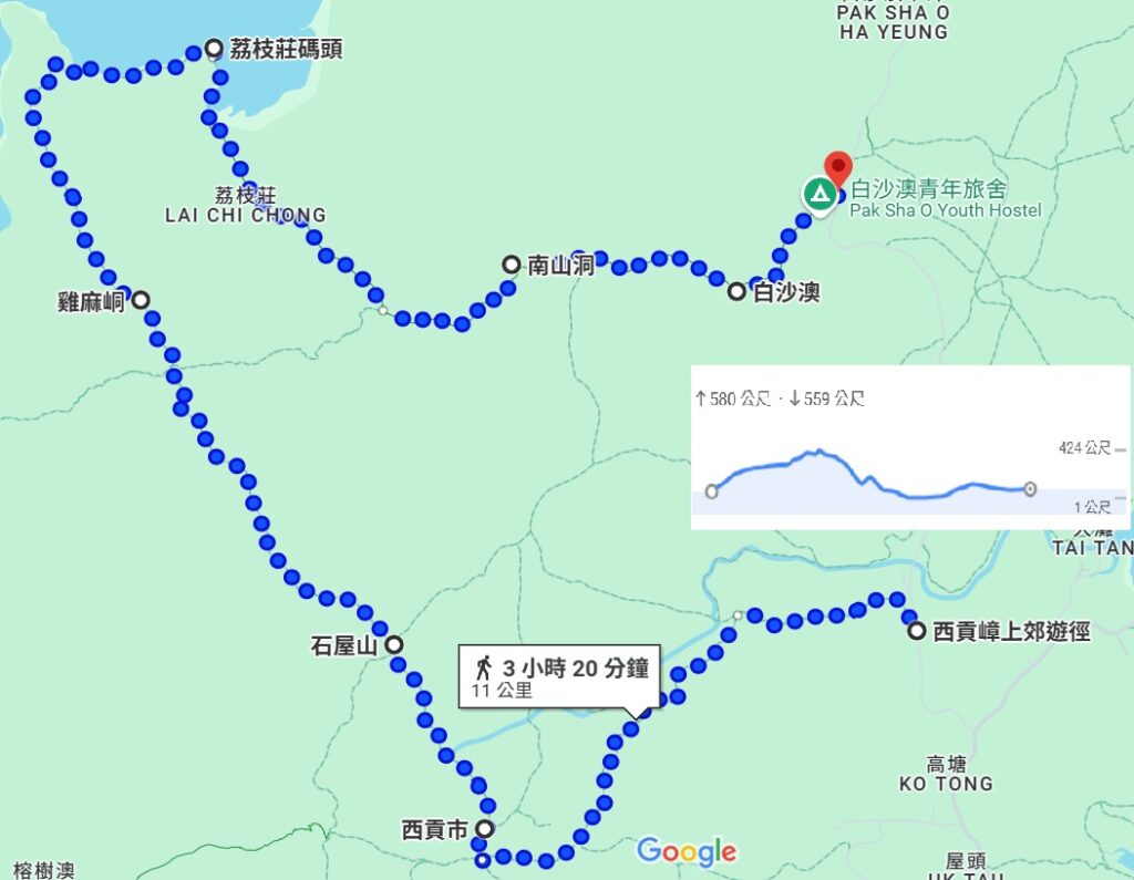 - 路線︰ 海下路➡嶂上郊遊徑➡石屋山➡蛇石坳➡雞麻峒➡白角仔➡荔枝莊 ➡南山洞➡白沙澳