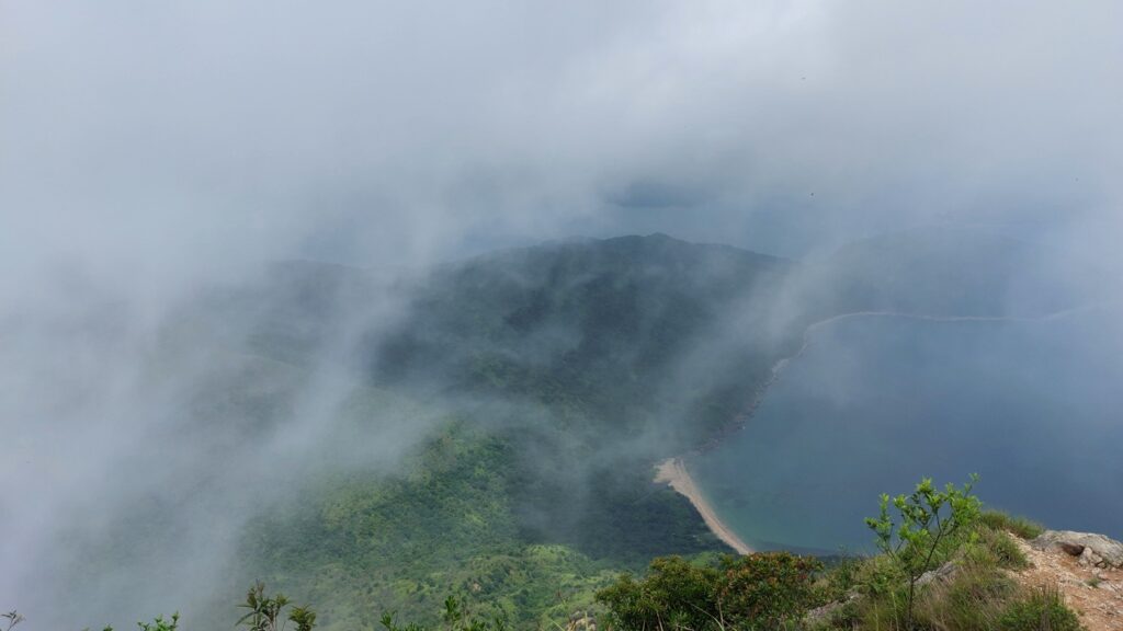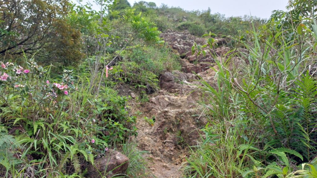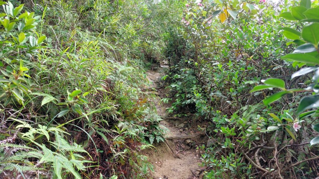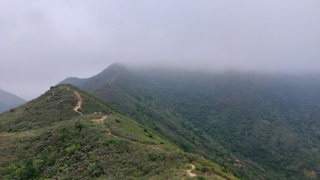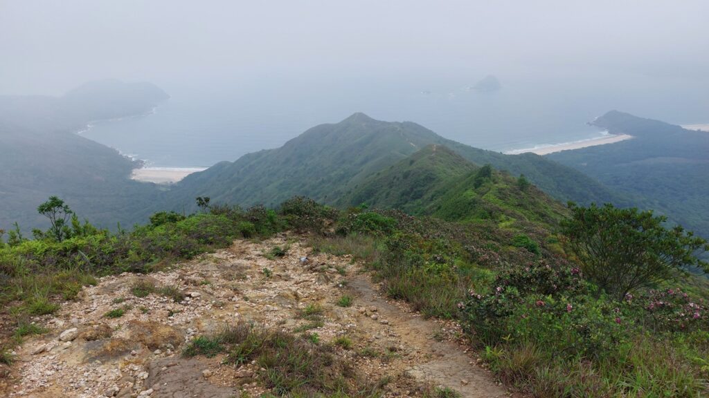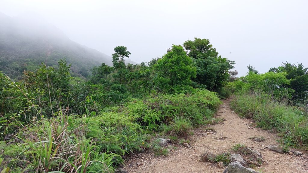 行程因故改變。原計劃是標準的線路,大浪坳上攀蚺蛇尖,東邊下再登米粉頂,再沿路落東灣,過大灣和咸田灣返回北潭凹。當登上蚺蛇尖時,霧太大,看不到四周景觀,更看不清前方的路。為了安全,決定不再行米粉頂,而原路下山。當下山至半山坳時,看到有分岔路可落大灣。看時間還算早,決定落大灣,再續行程。剛下山不遠,就聽行山人士說,蚺蛇尖往米粉頂的路非常險峻危險,看來決定正確。