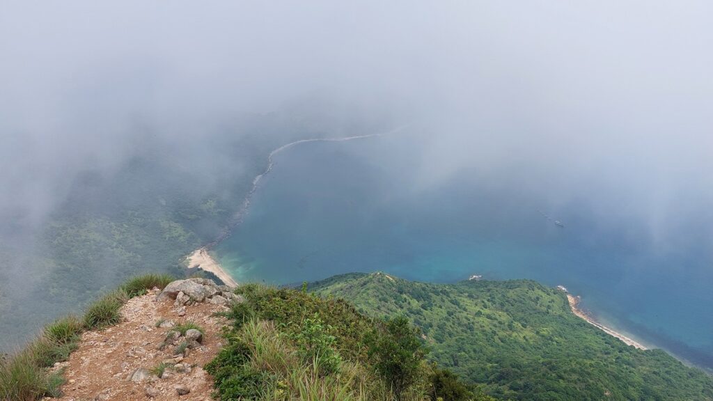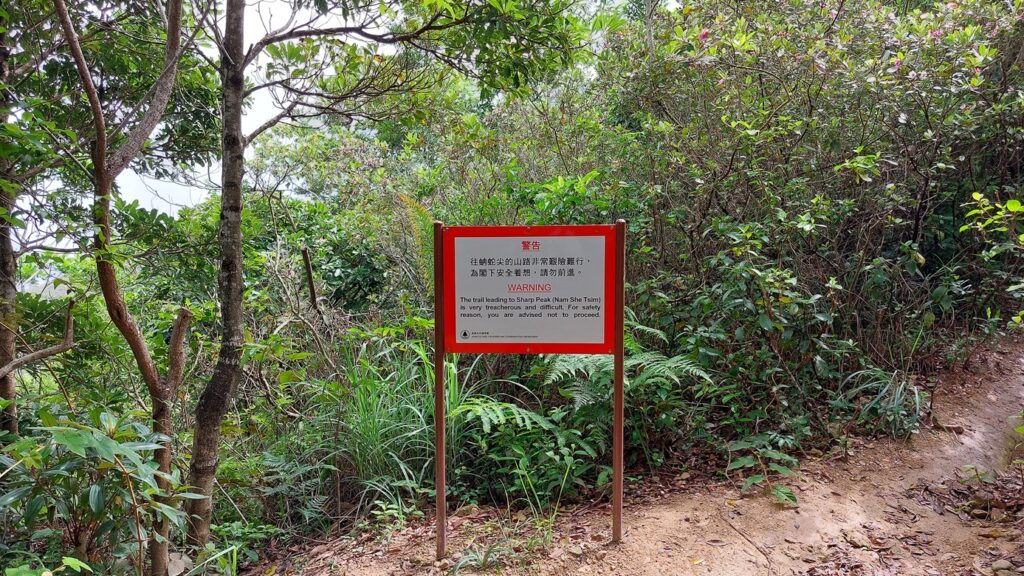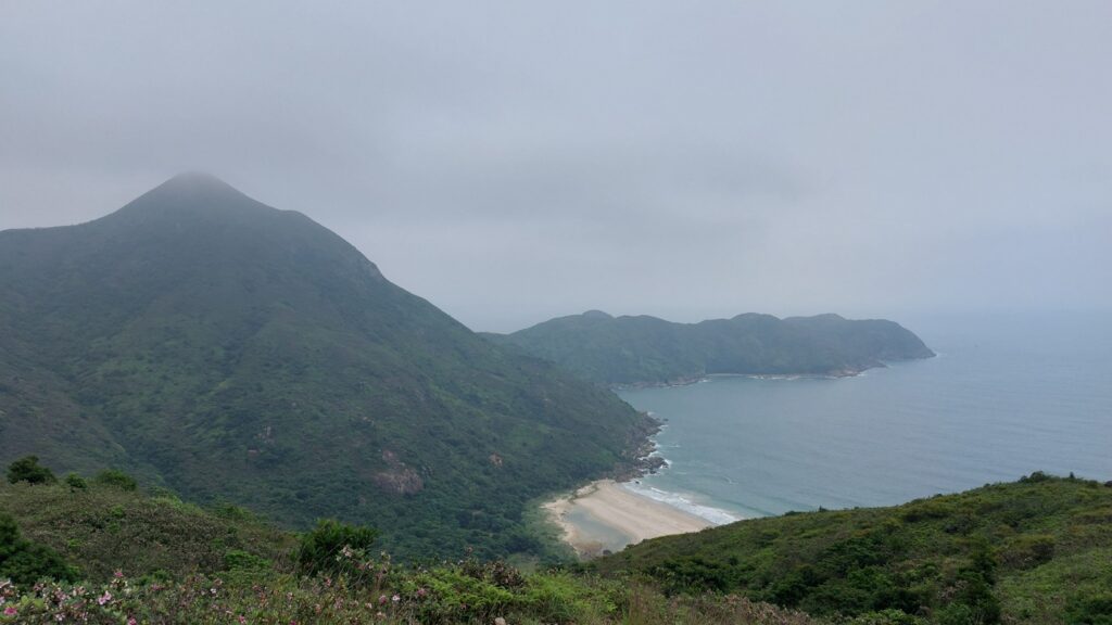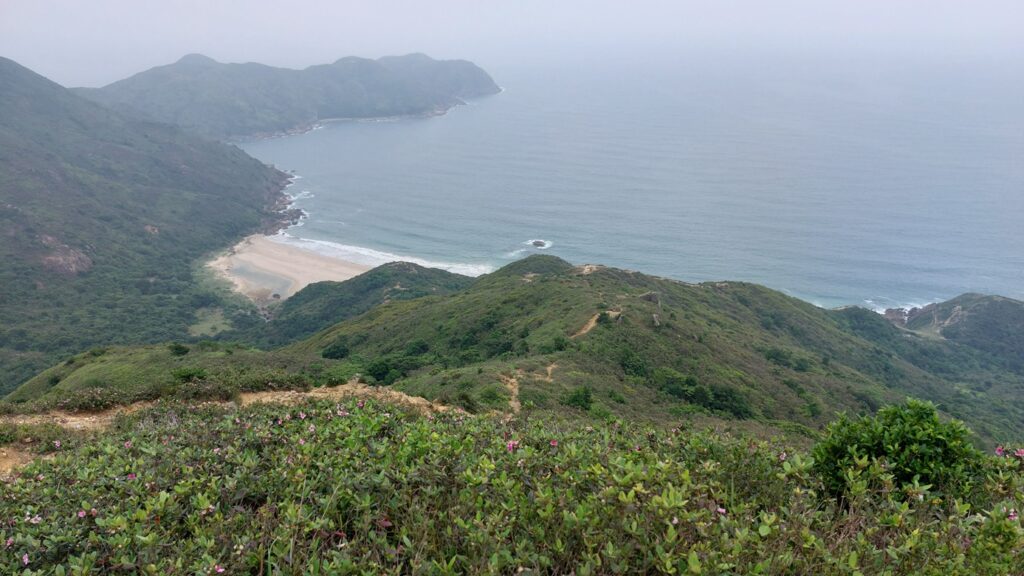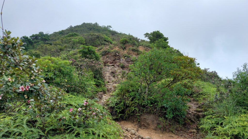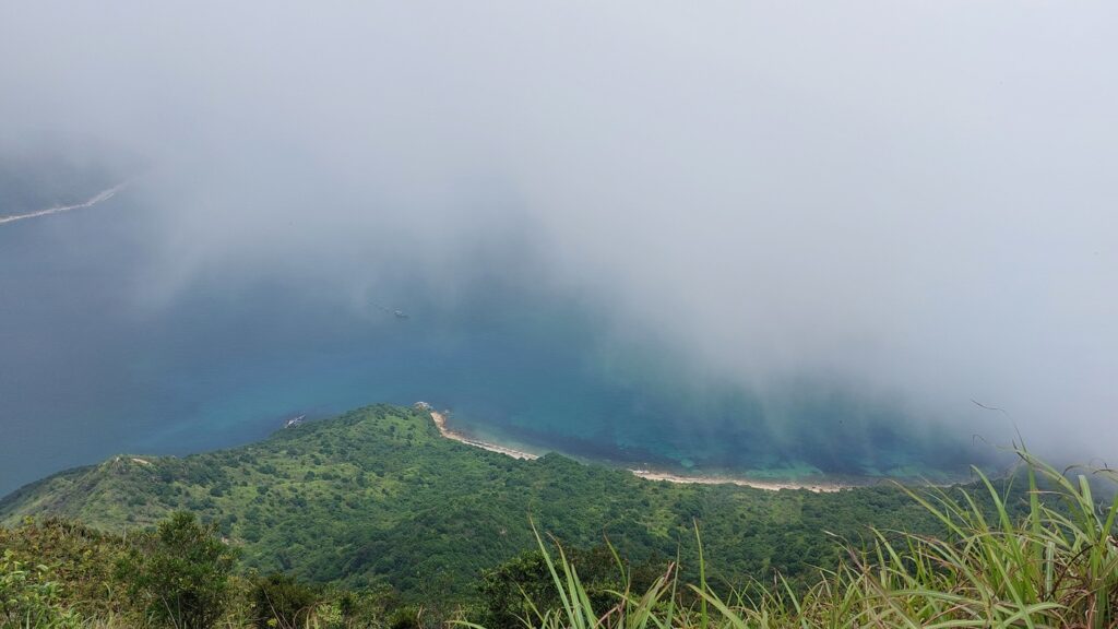 行程因故改變。原計劃是標準的線路,大浪坳上攀蚺蛇尖,東邊下再登米粉頂,再沿路落東灣,過大灣和咸田灣返回北潭凹。當登上蚺蛇尖時,霧太大,看不到四周景觀,更看不清前方的路。為了安全,決定不再行米粉頂,而原路下山。當下山至半山坳時,看到有分岔路可落大灣。看時間還算早,決定落大灣,再續行程。剛下山不遠,就聽行山人士說,蚺蛇尖往米粉頂的路非常險峻危險,看來決定正確。