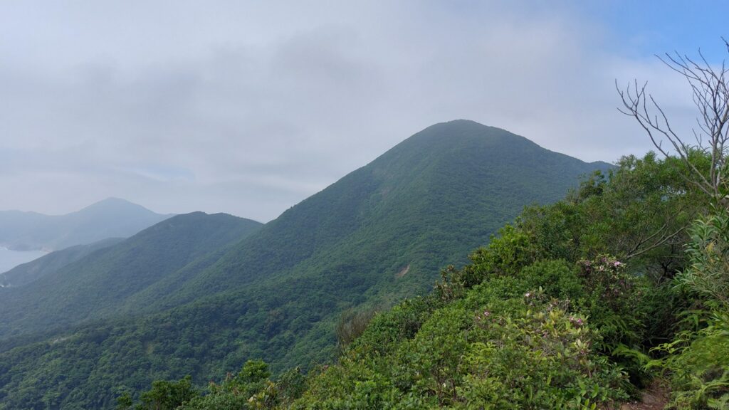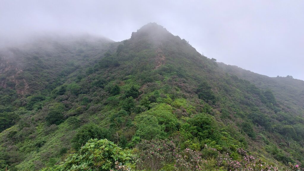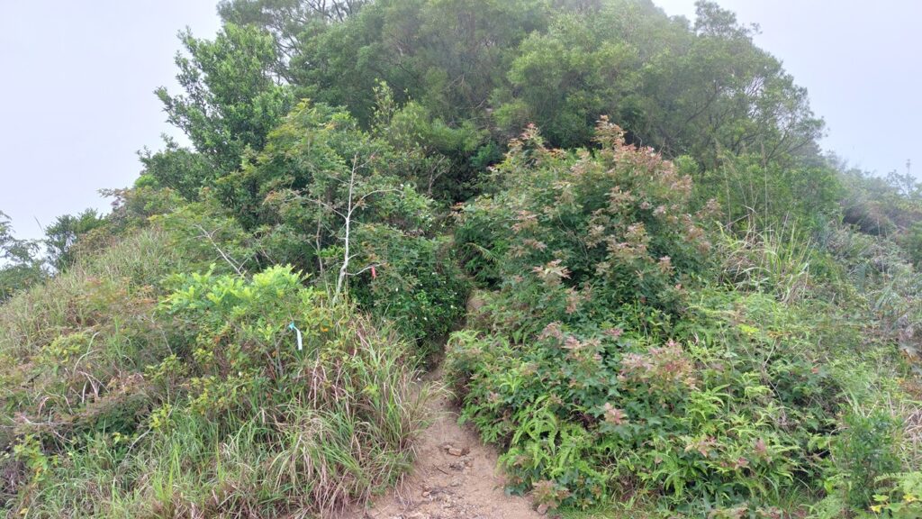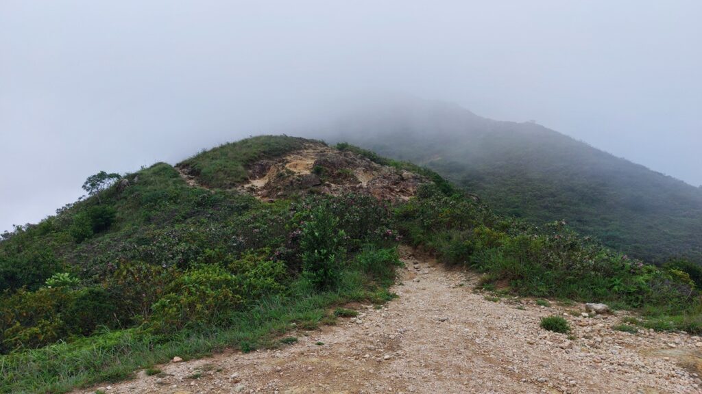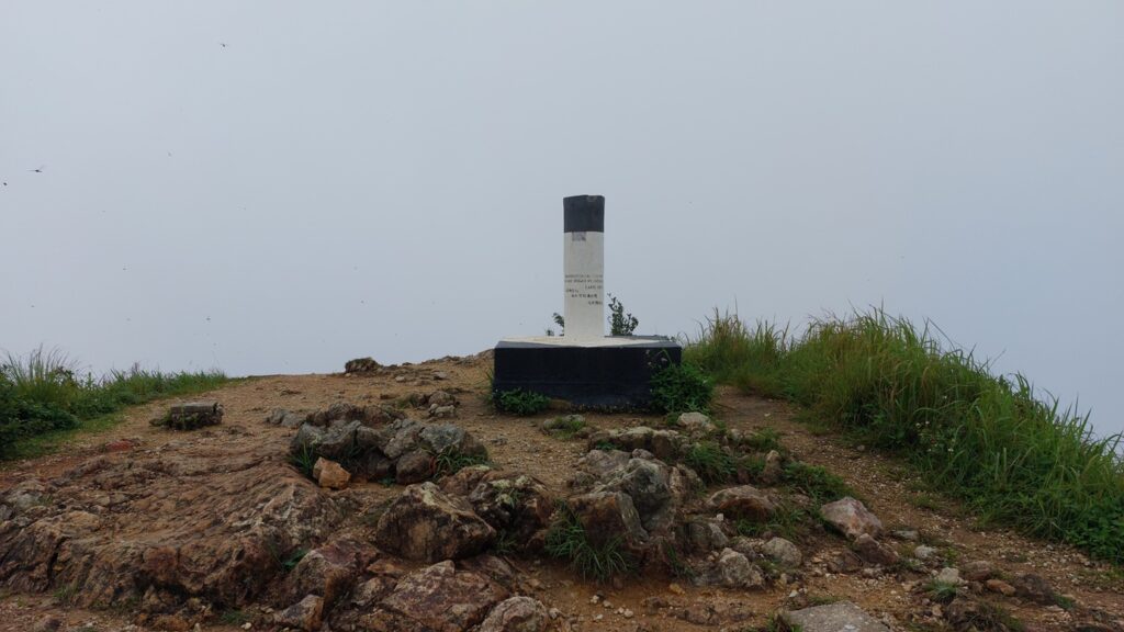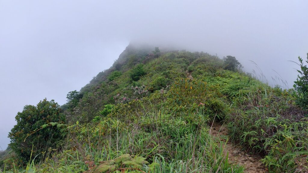 登上蚺蛇尖,十米開外都看不到,更別說四周的景觀了。等了約半個鐘,北面的雲霧散開少許,隱約可見北邊的海景。原計劃是從東脊下山往米粉頂,霧大看不到米粉頂,也看不到前方的路。出於安全考慮,決定更改路線,不再行米粉頂,原路下山。