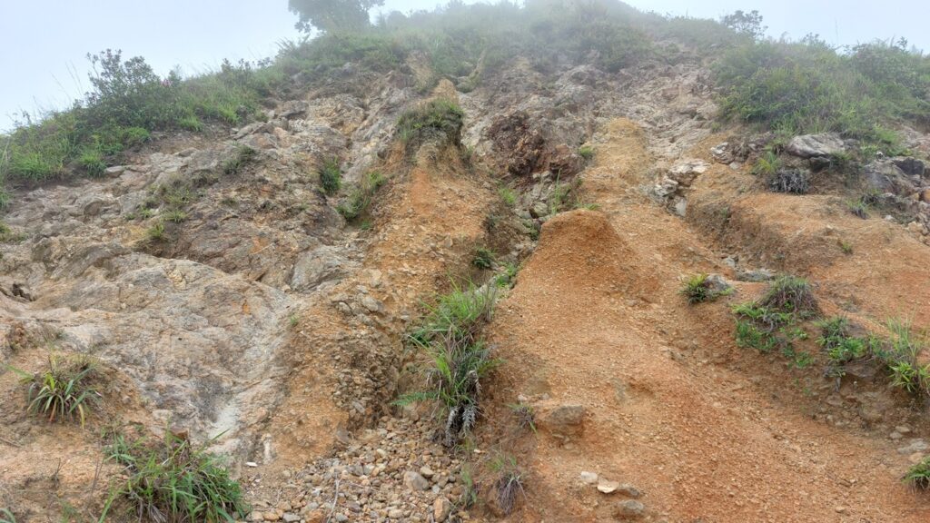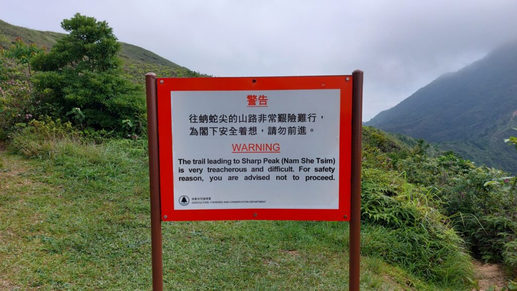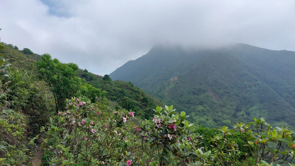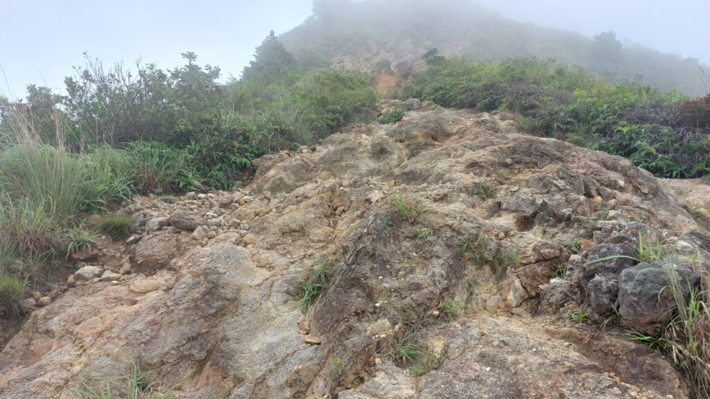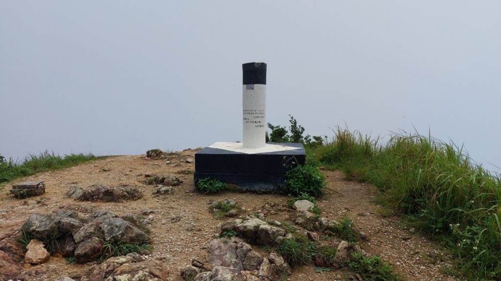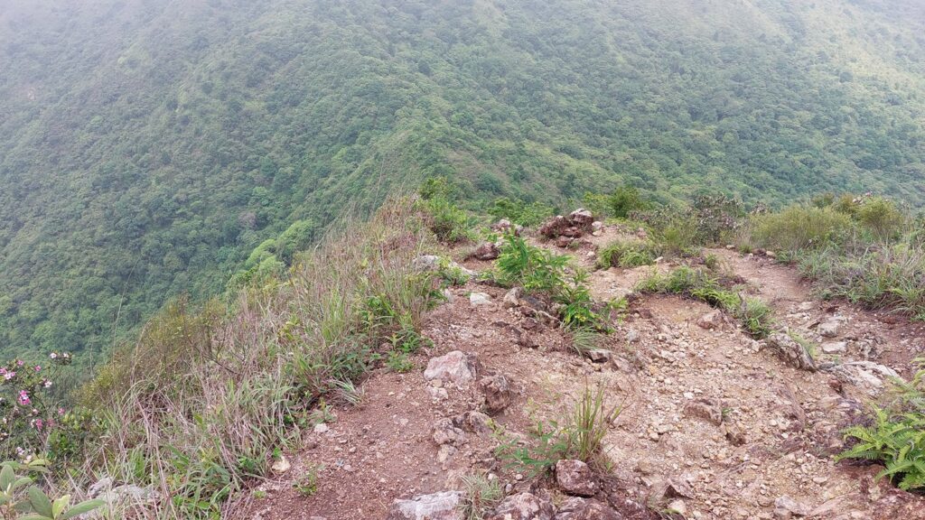 登上蚺蛇尖,十米開外都看不到,更別說四周的景觀了。等了約半個鐘,北面的雲霧散開少許,隱約可見北邊的海景。原計劃是從東脊下山往米粉頂,霧大看不到米粉頂,也看不到前方的路。出於安全考慮,決定更改路線,不再行米粉頂,原路下山。