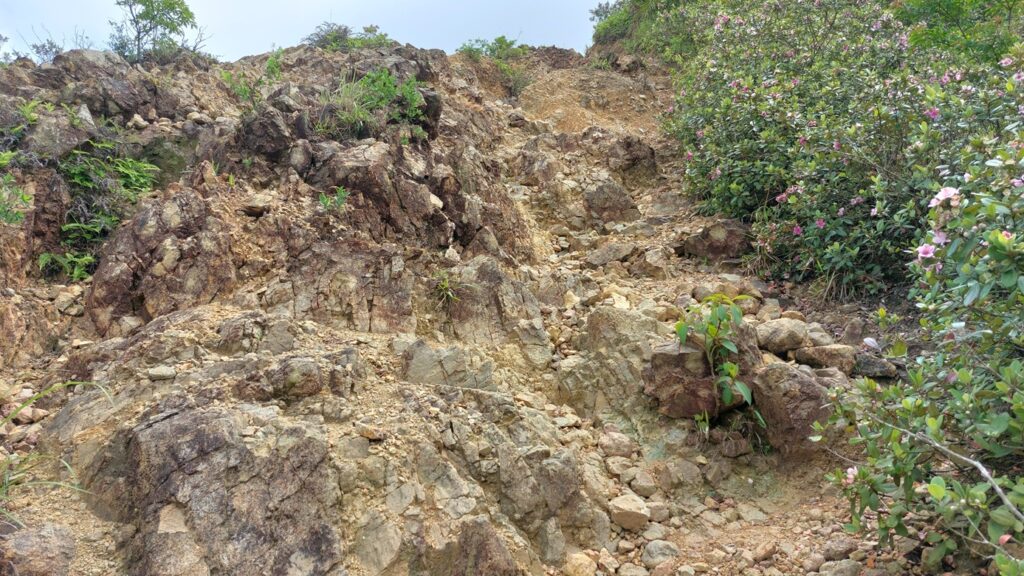 左方小徑往蚺蛇尖。先經蚺蛇坳,再沿三段明顯碎石陡坡上攀,直登蚺蛇尖山頂。