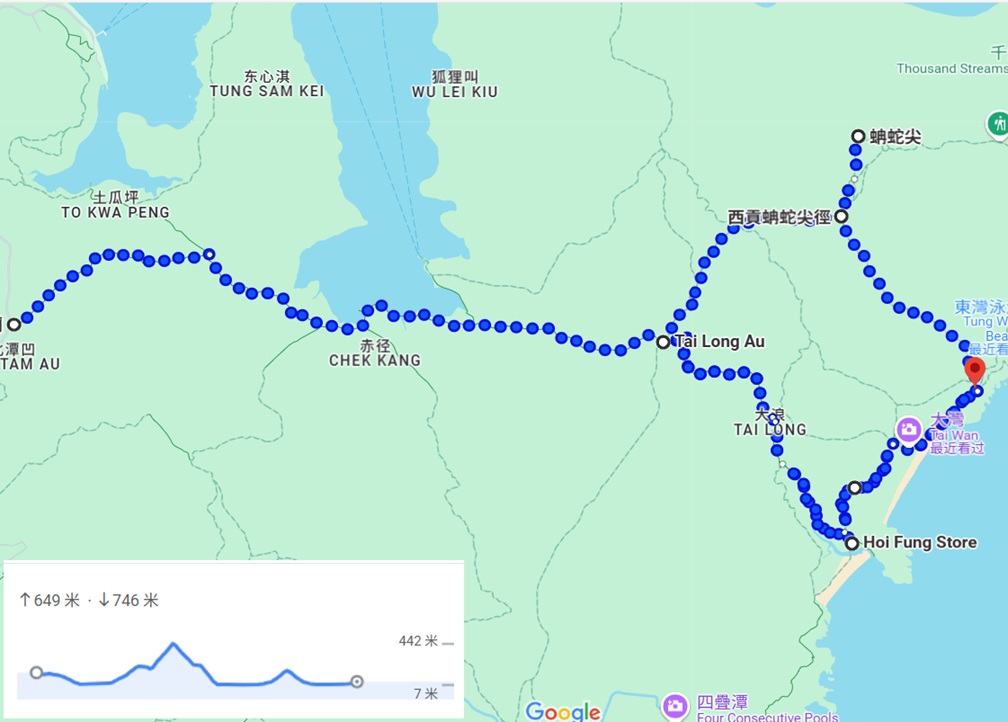 - 路線:北潭凹➡赤徑➡大浪坳➡蚺蛇尖➡米粉頂➡東灣➡大灣➡咸田灣➡北潭凹