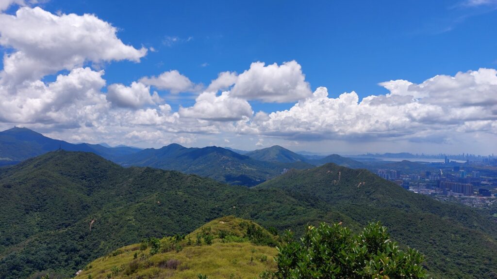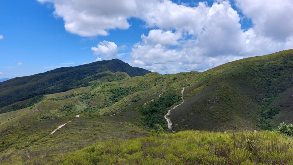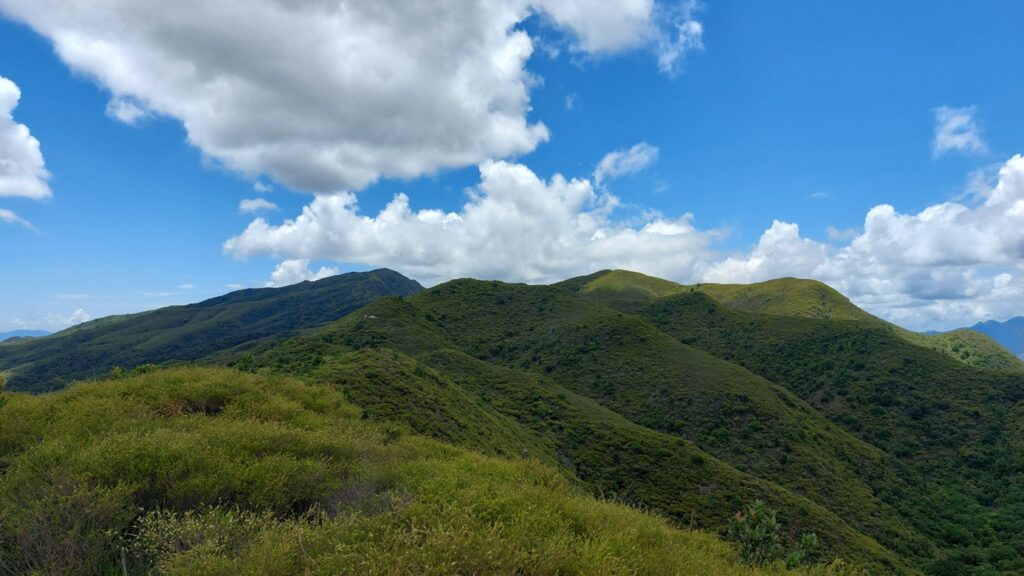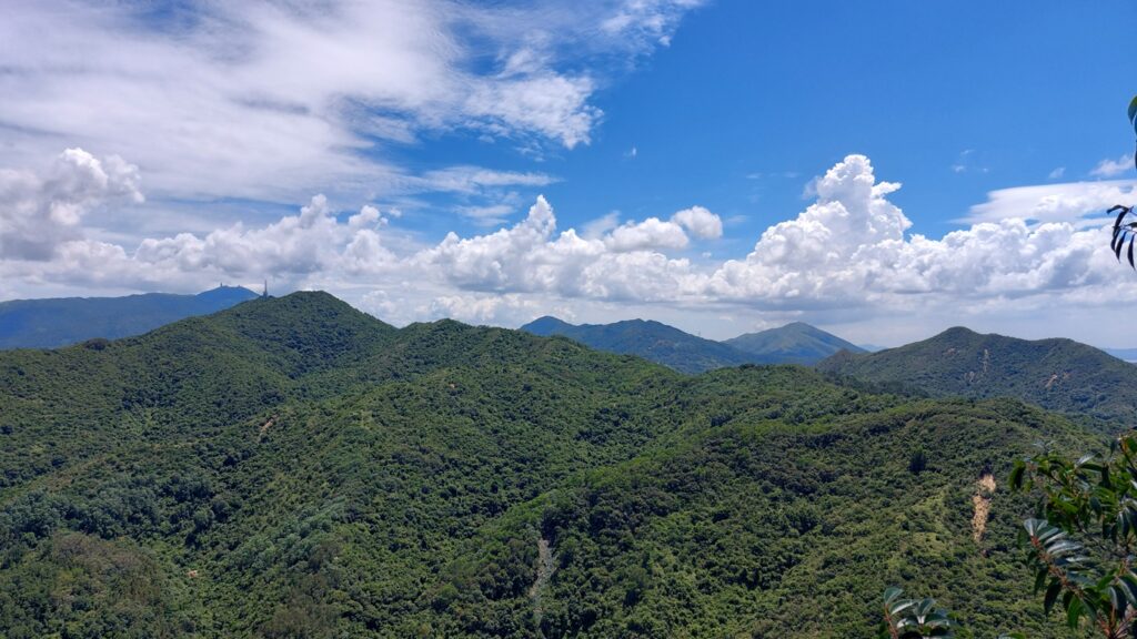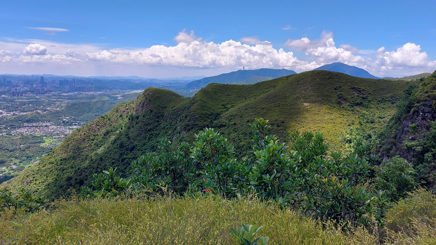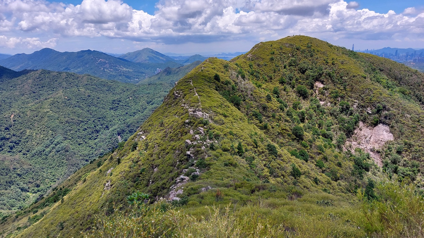 先經尖尾墩(435)攀上南山頂(466),再經長排崠(463)、大山峒(463)、青山頂(499),直至白燕岩頂(472),後落山至鶴藪水塘。