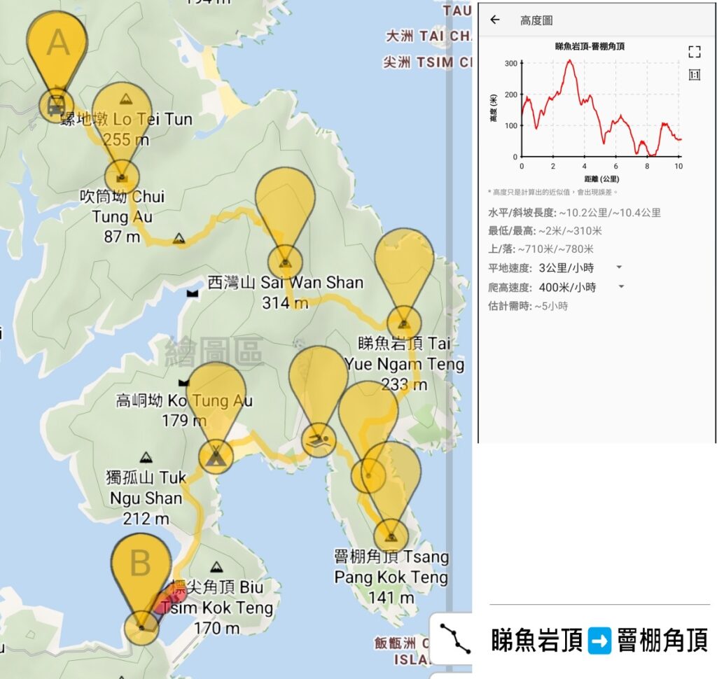 - 路線︰ 西灣亭➡吹筒坳➡西灣山➡睇魚岩頂➡長岩頂➡罾棚角頂➡罾棚角咀➡浪茄仔➡浪茄➡東壩